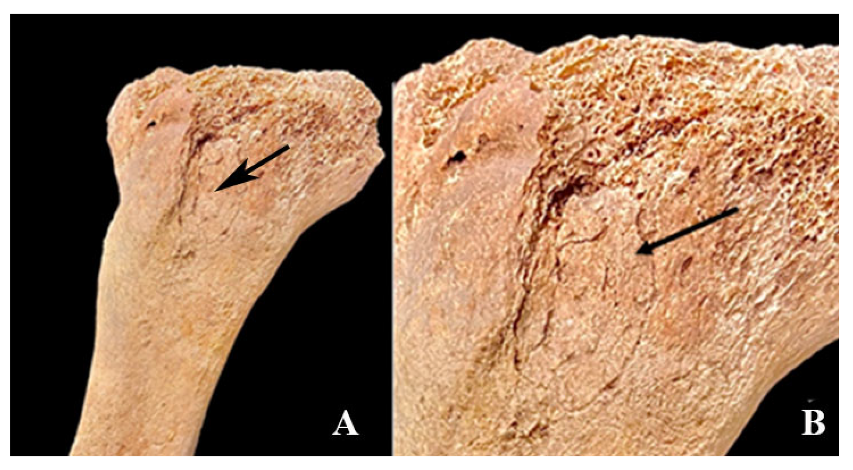 - Ortner, D.J. Identification of Pathological Conditions in Human Skeletal Remains, 2nd ed.; Academic Press: Cambridge, MA, USA, 2003; pp. 1–645. [Google Scholar]