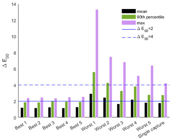 Figure 4 summarizes the color accuracy for the top- and bottom-ranked filter pairs and the single-capture method using the tunable LED light. These filter pairs are labeled Best and Worst, 1 through 5, for ease of understanding. These are not the same filter pairs ranked highest and lowest for the Broncolor strobes.