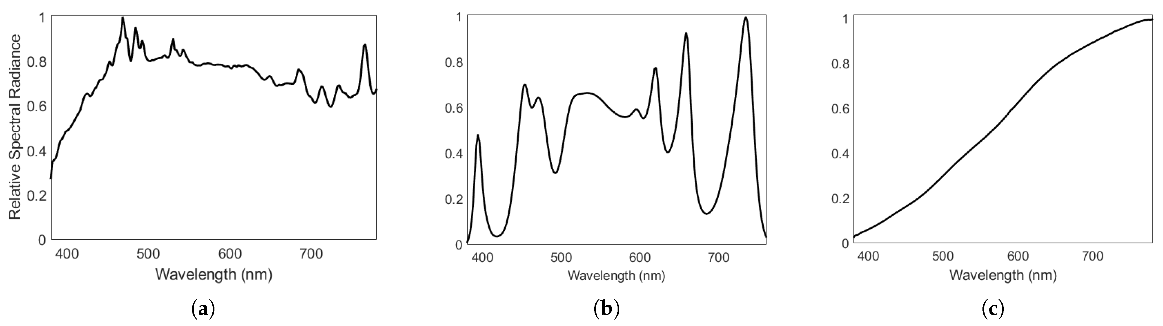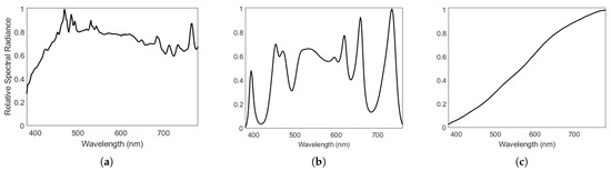 Normalized spectral power distributions of the (a) Broncolor Pulso G strobe, (b) LED approximation of D50, and (c) Broncolor PulsoG modeling lamp.