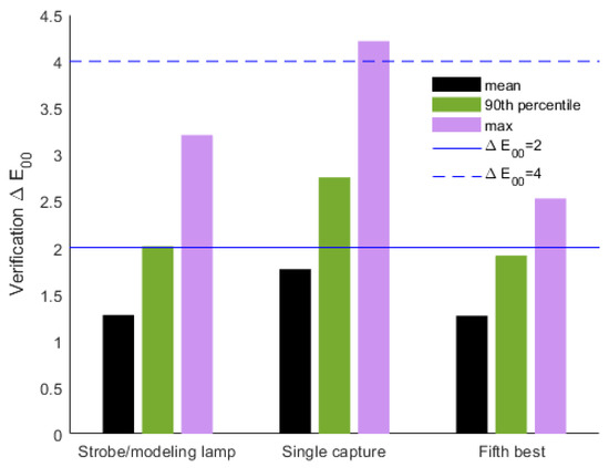 The final lighting considered was a pairing of the Broncolor strobes with the accompanying modeling lamp. One of the advantages of this condition is that the exposures are adjusted via aperture for the strobe but shutter speed for the modeling lamp. This means that the maximum exposure without overexposure could be obtained for both lights simultaneously, despite differences in radiance, increasing the signal-to-noise ratio for all channels. Figure 5 summarizes the color accuracy using this method compared to single capture with the Broncolor strobes.