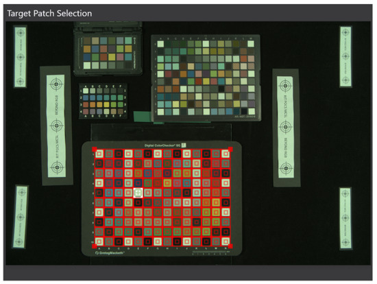 In BeyondRGB, the color target patches are manually selected using a grid and coordinate system, as shown in Figure 6. These pixels are averaged and then used to fit a transformation and calculate color differences.