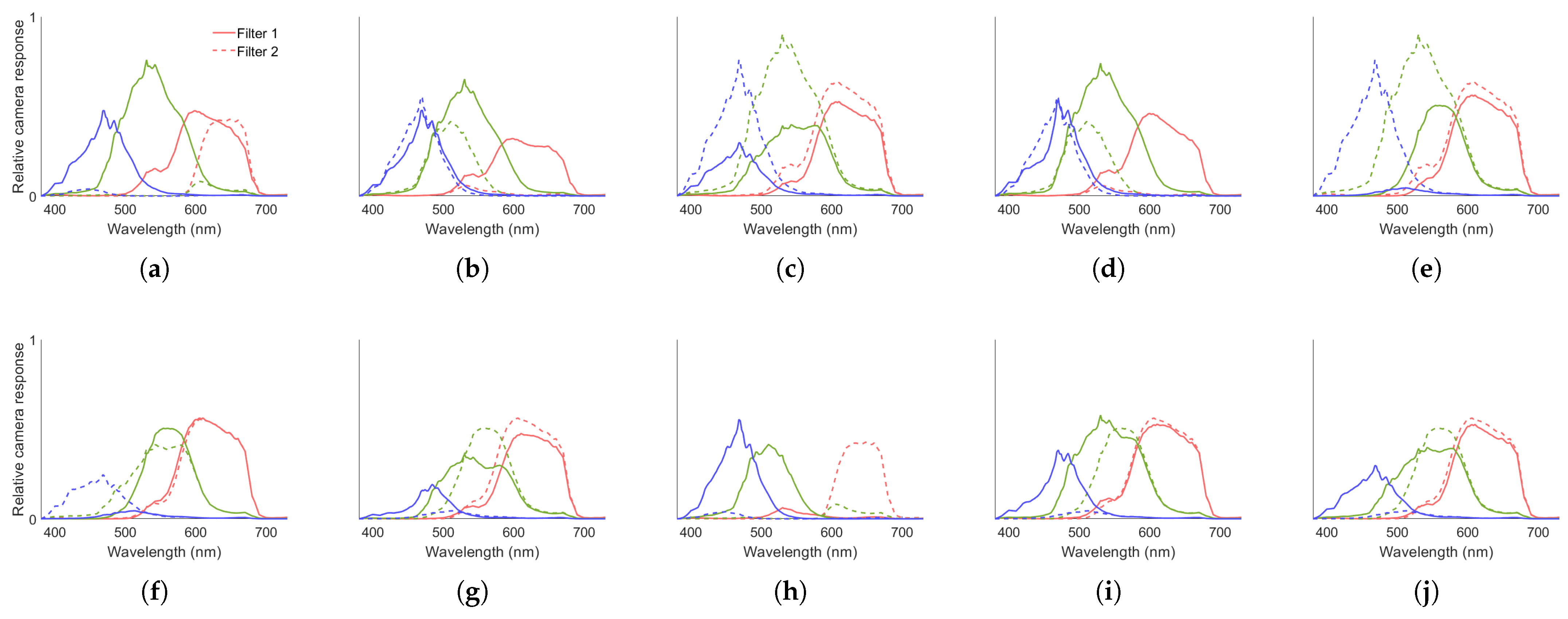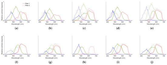 Camera spectral responses relative to the unfiltered Broncolor light for the filter pairs: (a) Best 1, (b) Best 2, (c) Best 3, (d) Best 4, (e)Best 5, (f) Worst 1, (g) Worst 2, (h) Worst 3, (i) Worst 4, and (j) Worst 5. The red lines correspond to the red channel, green to the green channel, and blue to the blue channel.