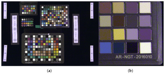 The color target images contained the same CCSG and NGT targets that were used in the filter selection simulation. The targets were placed as close to the center of the frame as possible to minimize any specular highlights and manually adjusted as needed to ensure that no highlights were visible in the image, as this would interfere with the color calibration. Registration targets were also placed within the scene to help the BeyondRGB software register the two captures.
