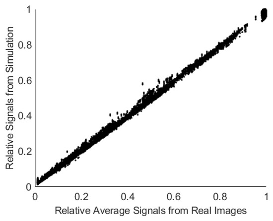 As described in Section 2.3, the verification simulation uses measurements from Broncolor strobes, the Canon camera, and available filters as an input. It follows the same processing steps as BeyondRGB as much as possible. This simulation is capable of predicting the camera signals very well. There are some differences in scale due to exposure steps when working with a real camera, which were not replicable in the simulation. When normalized by the maximum signal, the relationship between the simulated and average real camera signals is highly linear, as shown in Figure 10.