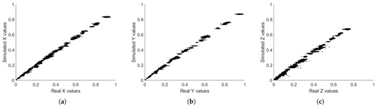 Correlation between the simulated and real estimated 1931 tristimulus values (a) X, (b) Y, and (c) Z.