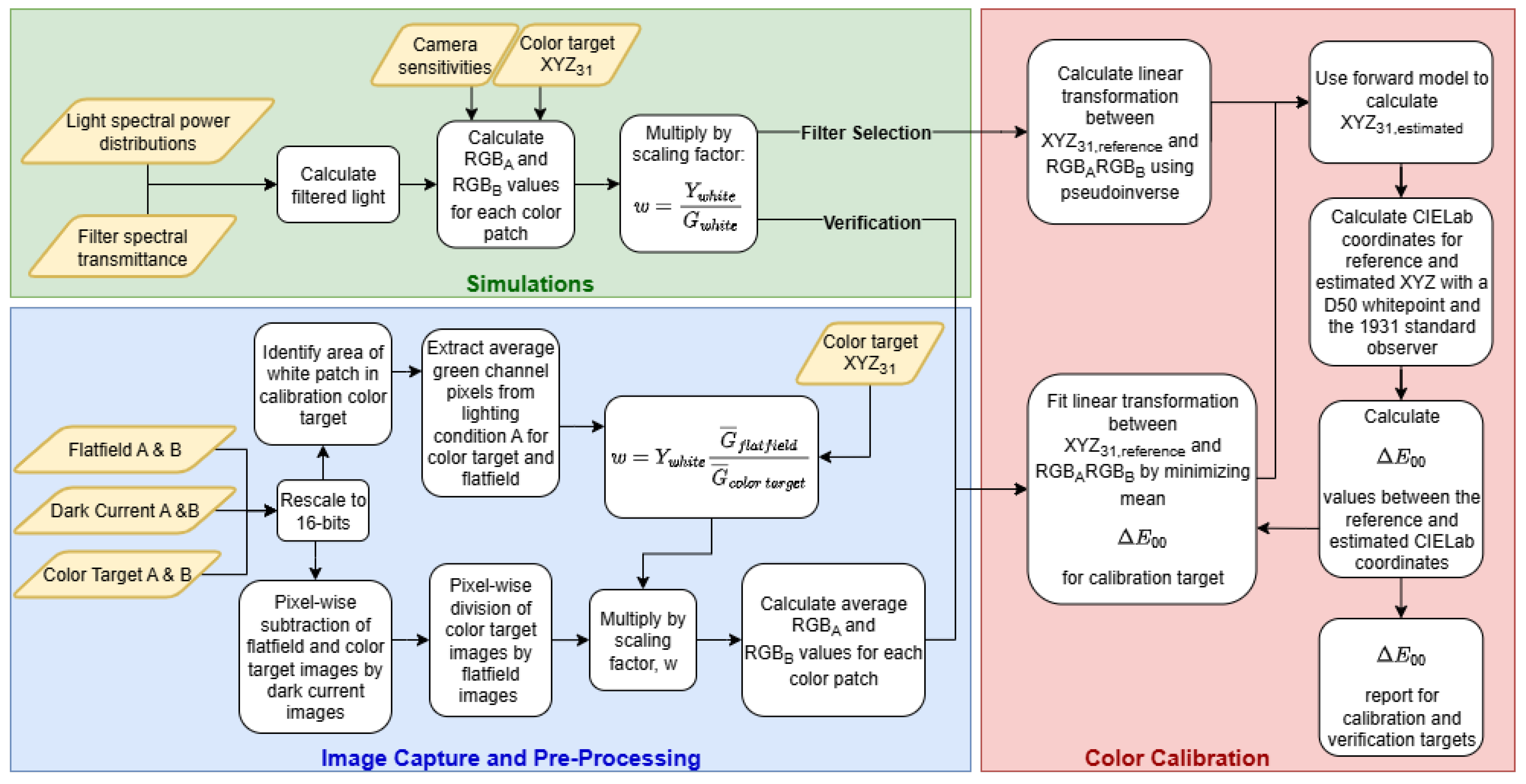 A flowchart describing the color pipeline for the filter selection simulation, the image capture and processing, and the verification simulation.