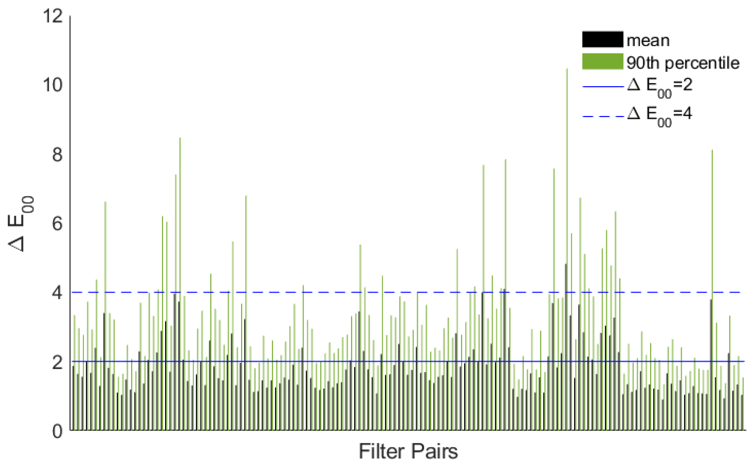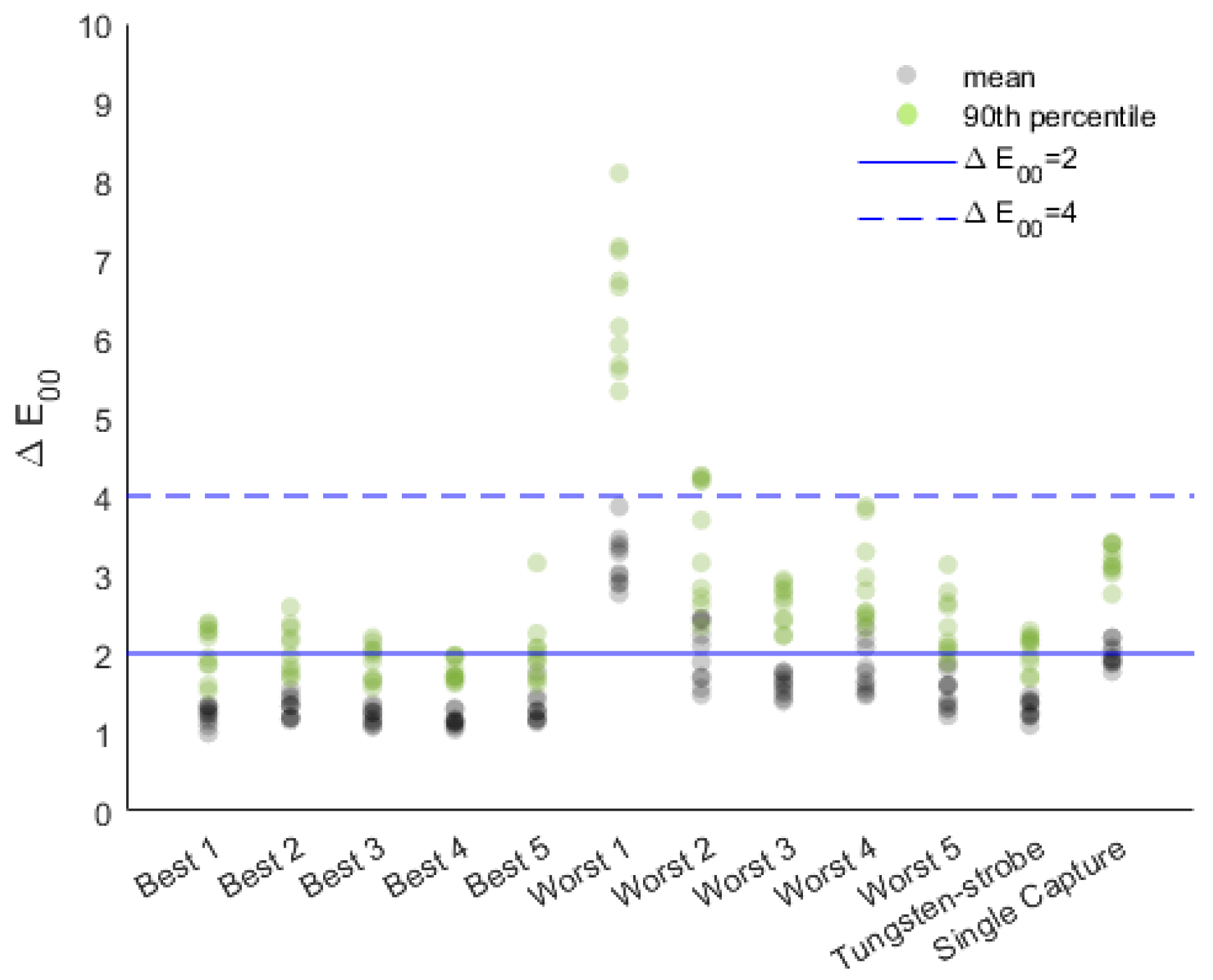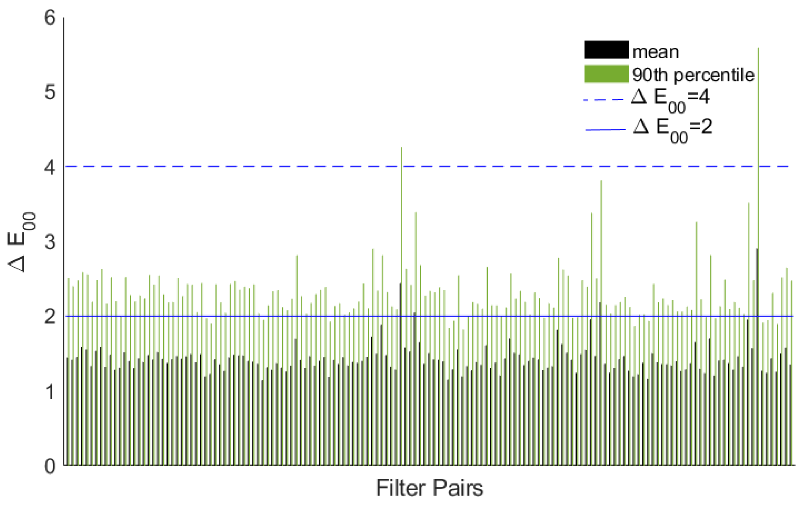 Almost all of the filter pairs result in high color accuracy, as does the single-capture method. All but three of the conditions meet the FADGI four-star color accuracy parameters of a mean and a 90th percentile of . It is not surprising that the single-capture method has such high color accuracy. Broncolor strobes are widely used within the cultural heritage community and are known to be excellent for color reproduction.