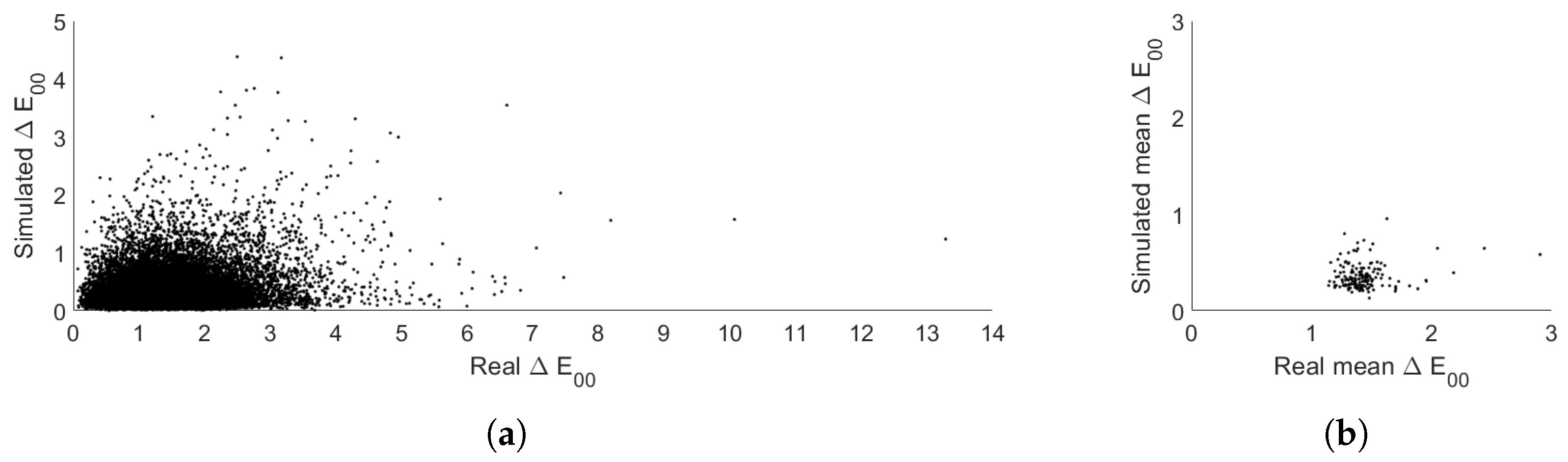 Correlation between the simulated and real values, as calculated from the estimated and reference tristimulus values for (a) all individual values and (b) the mean of each filter pair.