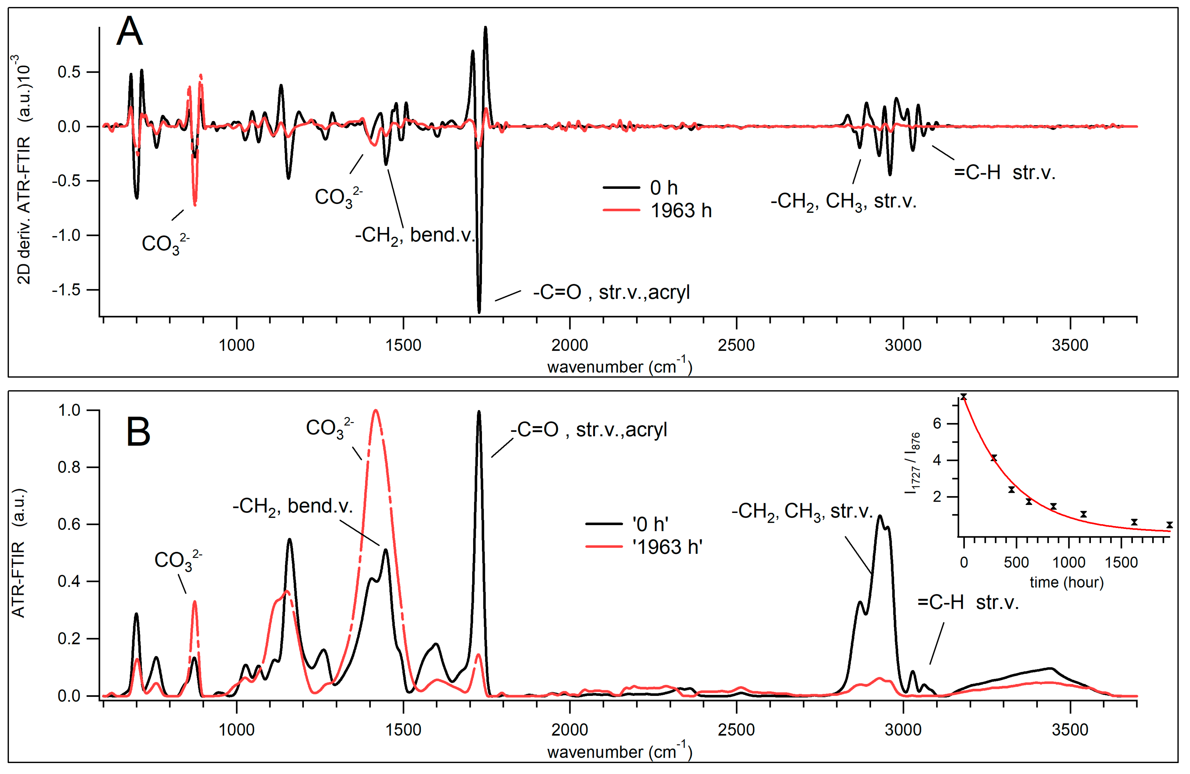 - Narrowing of the carbonyl ester peak on the higher wavenumber side, consistent with oxidative cleavage of ester groups in the acrylic binder;