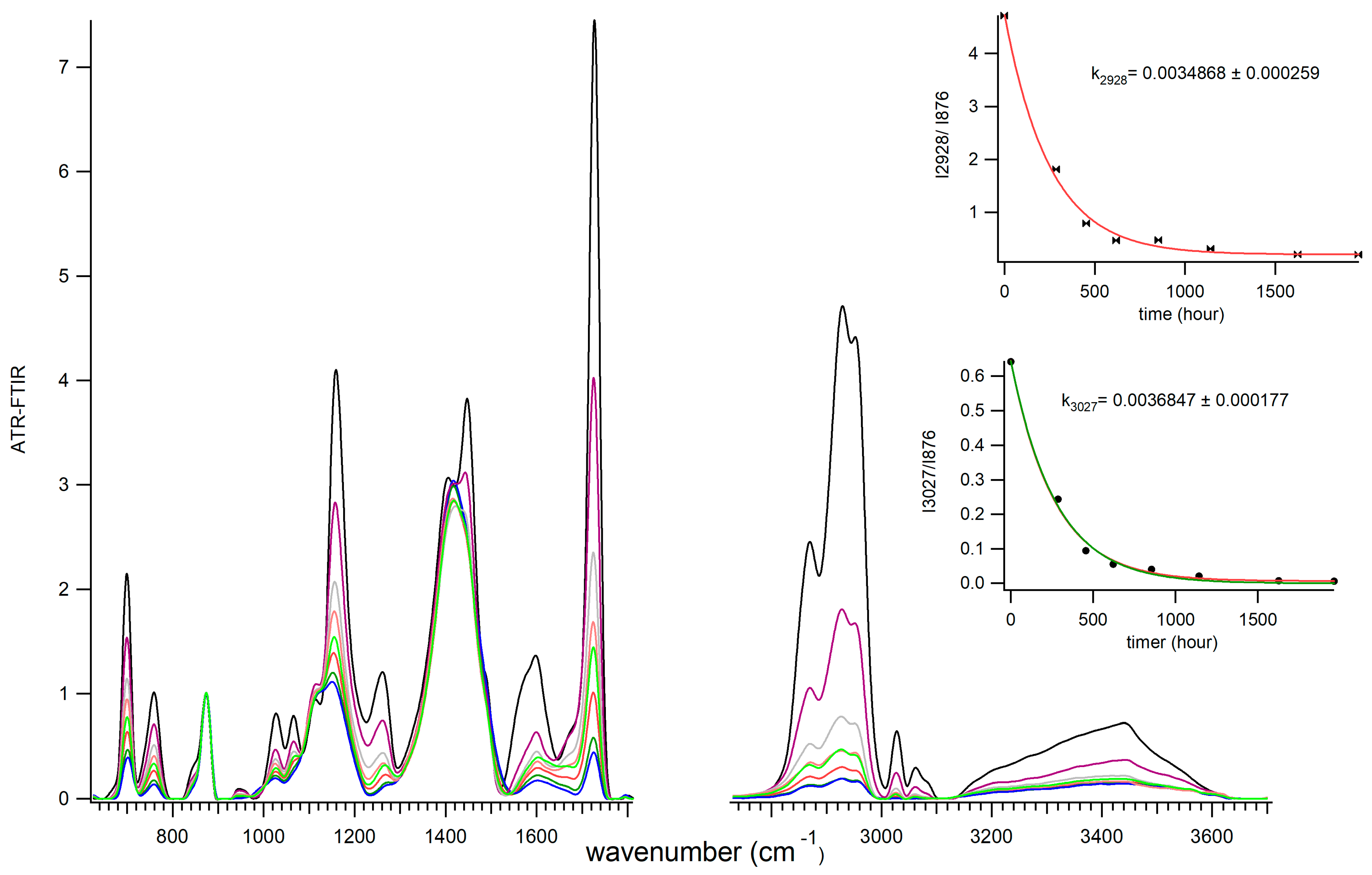 - Asymmetric broadening of the C-H stretching vibration band (at ~2700–2850 cm−1), likely corresponding to the formation of the degradation products, e.g., aldehyde at 2695–2830 cm−1 (with a weak Fermi doublet at 2720 and 2820 cm−1 registered for aged samples).