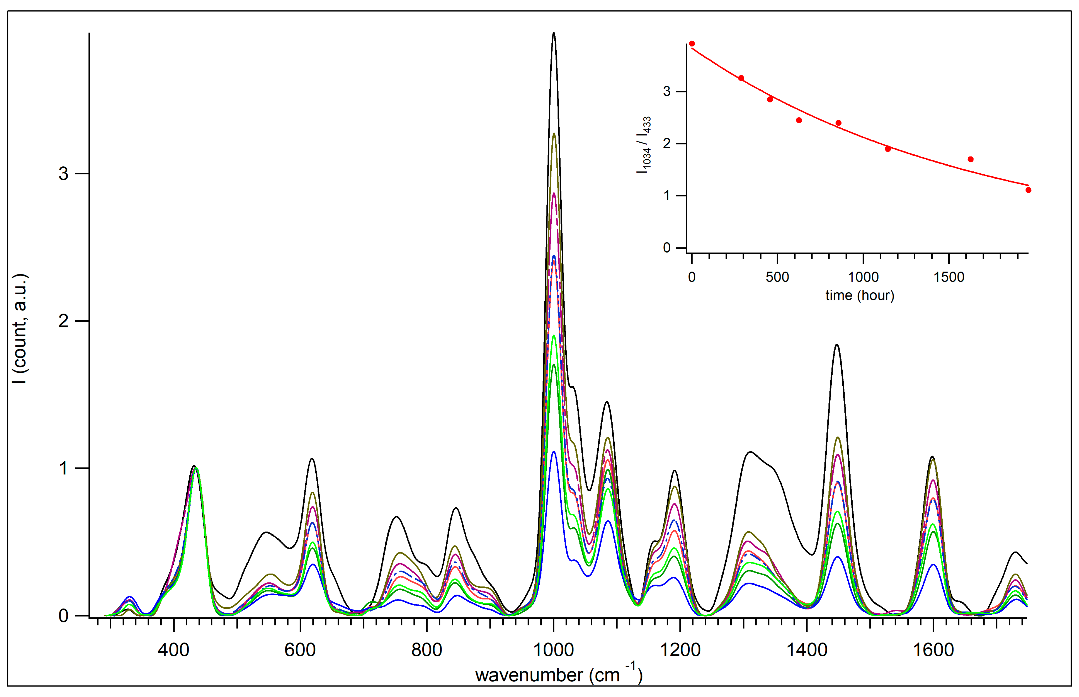 3.5. Aging of Acryl Zinc White PW4 Paint Revealed by Micro-Raman Spectroscopy