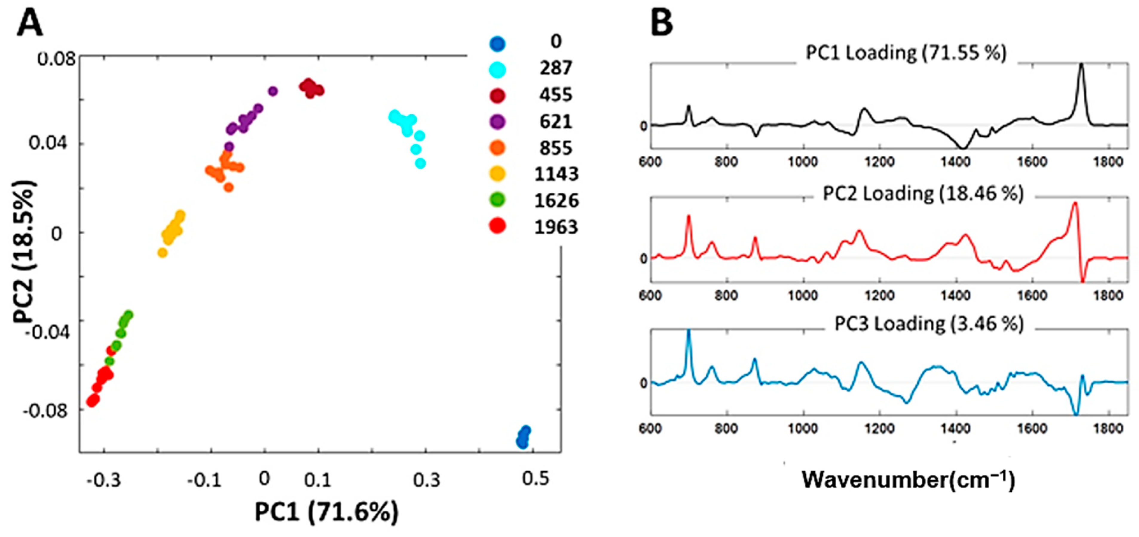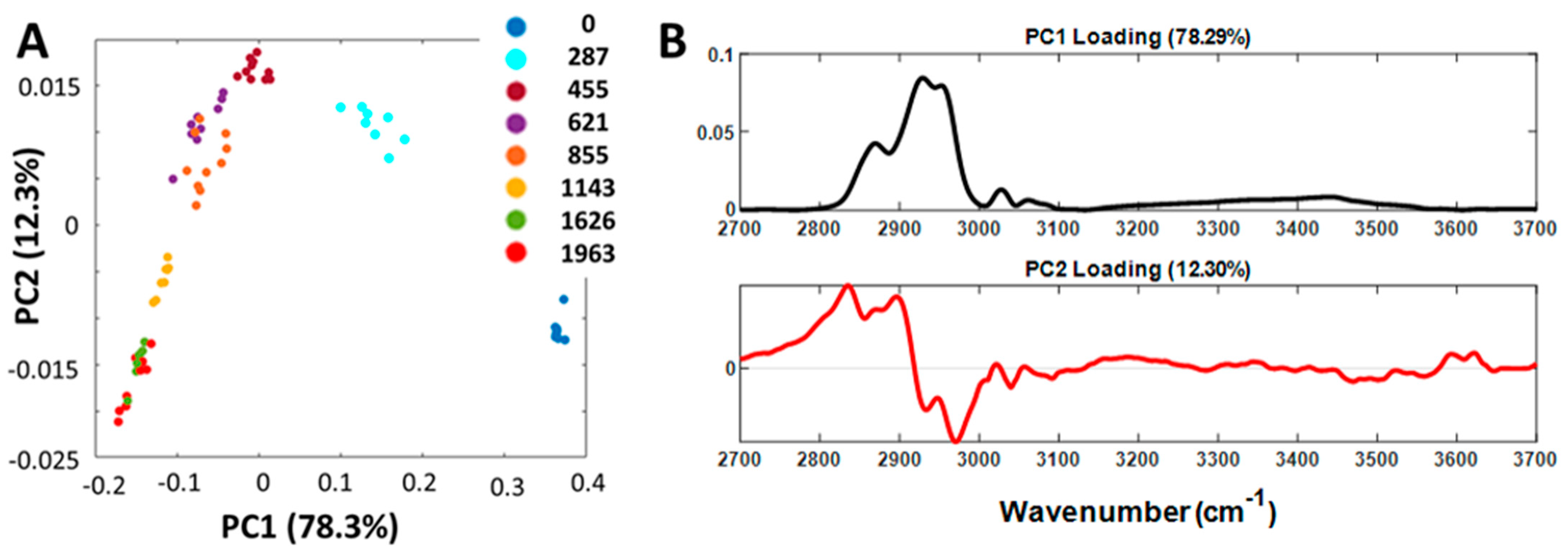 - A non-uniform reduction in the peak intensity, where the PC2 positive loadings represented the spectral regions that were more resistant to decreases, such as symmetric stretching vibrations at 2873 cm−1. In contrast, negative loadings represented bands more susceptible to radical attack, including asymmetric stretching vibrations of the -C-H groups of alkenes and aromatic compounds.