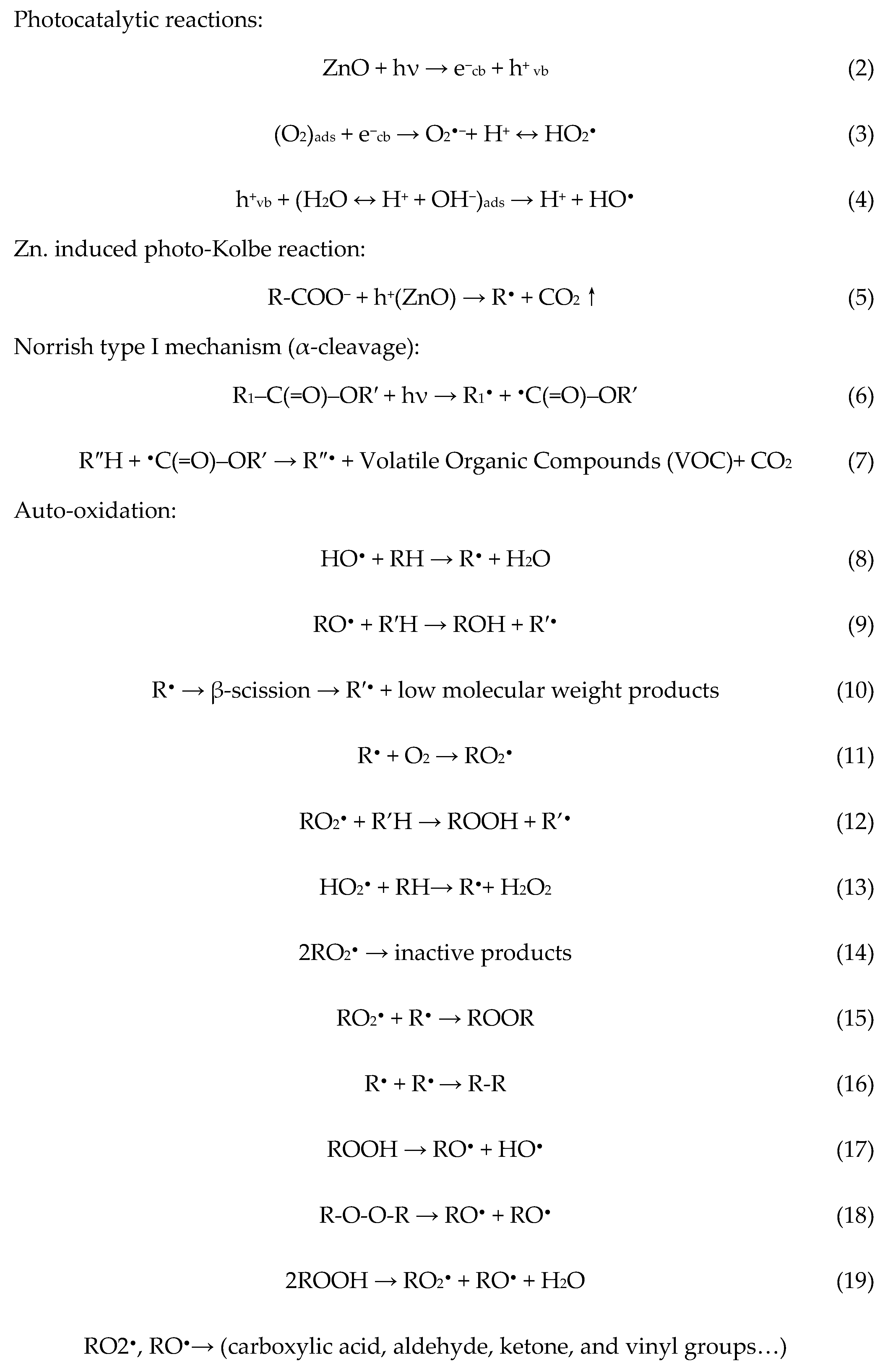 - Nguyen, T.V.; Dao, P.H.; Nguyen, T.A.; Dang, V.H.; Ha, M.N.; Nguyen, T.T.T.; Vu, Q.T.; Nguyen, N.L.; Dang, T.C.; Nguyen-Tri, P.; et al. Photocatalytic Degradation and Heat Reflectance Recovery of Waterborne Acrylic Polymer/ZnO Nanocomposite Coating. J. Appl. Polym. Sci. 2020, 137, 49116. [Google Scholar] [CrossRef]