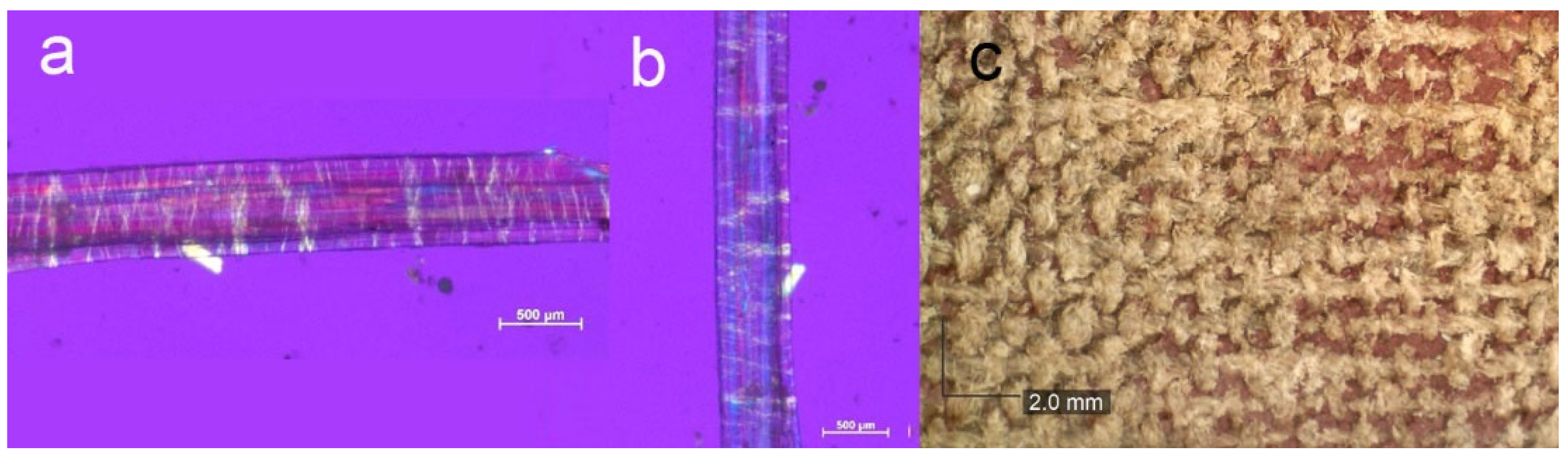 - Haugan, E.; Holst, B. Determining the fibrillar orientation of bast fibers with polarizes light microscopy: The modified Herzog test (red plate test) explained. J. Microsc. 2013, 252, 159–168. [Google Scholar] [CrossRef]