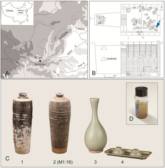 Jin Dynasty plum vase and liquid sample analyzed in this study. (A) Geographic location of the Li Jurou tomb. (B) Structure of the tomb chamber, showing the vase containing liquid in the northwest corner (arrow). (C) Assemblage of drinking wares: (1) meiping vase; (2) meiping vase with liquid contents (M1:16) analyzed in this study; (3) Yuhuchun vase; (4) two small cups and a rectangular celadon tray. (D) Liquid sample extracted for analysis (vial capacity: 15 mL).