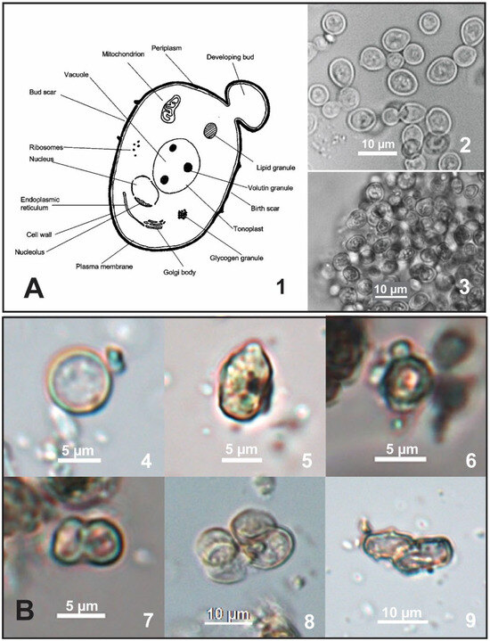 A total of 66 yeast cells were identified, representing two morphological types: spherical or oval forms (N = 56; 4.22–11.5 μm in length) and elongated oval forms (N = 10; 7.48–12.68 μm in length) (Table 1). The cells occur either as single units or in clusters. Several exhibit budding characteristics, indicated by small protrusions emerging from the parent cell or by pairs of cells remaining connected, suggesting an active stage of reproduction comparable to modern reference examples (Figure 2(4–9); cf. 2 and 3).