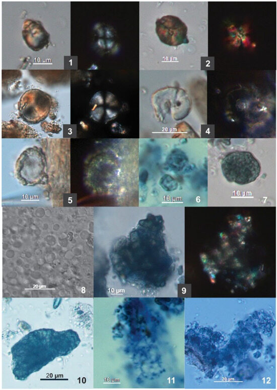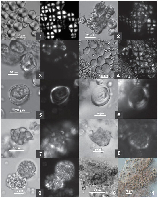 Starch taxonomic identification in this study was conducted according to established protocols outlined in earlier published studies, with particular attention to morphological features observed under light microscopy. The diagnostic features include granule shape and size, as well as general characteristics such as the hilum, fissures, lamellae, and extinction cross [26] (pp. 34–42).