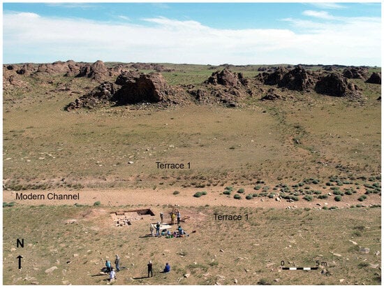 Major climatic changes have occurred throughout the late Pleistocene and Holocene in the eastern Gobi. At the Last Glacial Maximum (LGM), large saline lakes filled many of the linear basins in the region. The presence of Paleolithic sites on the high beach ridges around these basins testifies to the use of these lake environments by Pleistocene period hunter–gatherers who visited these locations []. These high lake stands were most likely a result of cooler temperatures inhibiting evaporation from their enclosed basins, rather than significantly wetter environments. All indications from proxy data from lakes and speleothems suggest that most of the late Pleistocene was cold and dry, with increases in precipitation and warmth during the Bølling/Allerød period, from ca. 15,000–13,000 BP [,,]. Subsequently, the Younger Dryas climatic phase marked a shift back to cold dry conditions which lasted for about 1200 years from ca. 12,900–11,700 cal. BP. At this time, many of the large basin lakes disappeared, and erosion pockets marked the valley floor. The end of the Younger Dryas marked the beginning of the Holocene Epoch, our current interglacial episode.
