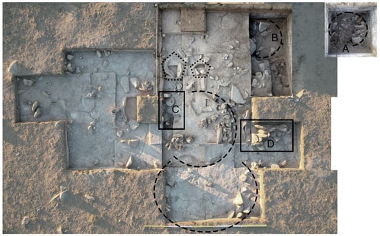 Overview of the Burgasny Enger excavations from the 2022 and 2023 seasons. Dashed lines are the walls of semi-circular structures; solid lines outline ovens; dotted lines indicate bins. (A) Feature 19 structure (9732 cal yrs BP), (B) Feature 20 structure (10,001 cal yrs BP), (C) Feature 4 oven (8494 cal yrs BP), (D) Feature 7 oven (6294 cal yrs BP).