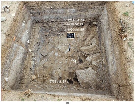 The remains from the earliest occupation of the site are located at the base of this terrace, at the same elevation as the modern-day drainage channel (Stratum 8) []. Our excavations encountered one semi-circular structure (Features 19) and one potential structure (Feature 20). Feature 19 is ca.150 cm in diameter, consisting of four large angular stones set on their sides with smaller supporting stones between them (Figure 3 and Figure 4). At the base of these two structures, the surface was lined with a clayey silt and contained patches of charcoal and black charcoal-rich sediment, indicating several small hearths. This early occupation surface contained fragmented bird bones, as well as some chipped stone artifacts. Radiocarbon analysis returned a date of ca. 9732 cal. BP (Feature 19), and ca. 10,001 cal. BP (Feature 20), placing this portion of the site within the beginnings of the Holocene Climatic Optimum, at a time period consistent with the later phase of the Oasis 1 archeological period [,].