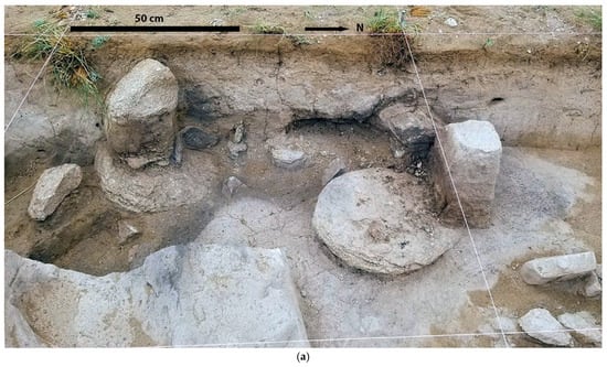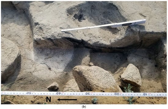 The top of the Pleistocene terrace adjacent to the channel (T1) was also occupied by foragers beginning at about 8000 cal BP (Occupation Unit 7). These early remains on the terrace immediately post-date the structure at the base of the Pleistocene terrace. They represent a semi-sedentary settlement that is profoundly unique in the Gobi. The site on the terrace edge contains two residential structures defined by a single circle of stones, forming an interior about 2 m in diameter (Figure 3). There are numerous such circular structures on the slope above our excavation area suggesting the possibility of a larger settlement, but these are undated because the interiors have been eroded out and replaced with fine sands washed in from the surrounding Pleistocene fine sandy sediments. Where the structures are more intact within our excavation trenches, the floors are lined with a coating of an unburnt marl mortar mixture less than 1 cm thick. Such pseudo-plaster is known from contemporary sites in West Asia such as those coating floors and walls at Neolithic Catalhoyuk, Anatolia, ca. 9000–8000 cal BP [,]. In situ early Holocene Neolithic sites in the Gobi are rare, making it difficult to compare this tradition of mortar construction with other contemporary sites. However, there are possible parallel mortar types found at Chikhen Agui []. Burgasny Enger would overlap with the later occupation horizon of the Chikhen Agui rockshelter.