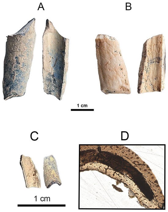 Both experts noted that taxonomic identification of faunal remains from the two seasons was hindered by the bad preservation of the bone, the fragmentation into small pieces, and in most cases the lack of epiphyses (the identifiable end of bone shafts). However, both researchers report that due to the small size, thinness of the shafts, and hollow configuration, most bones are consistent with bird taxa (Aves) (Table 2). In the 2022 Season report, Pleuger-Dreibrodt notes that the percentage of bird and likely bird bones constitutes 65.8% of the collection for that season. In addition, most bones were burnt, and bird bones were found in all occupation levels at the site. J. Clarke suggests the lack of any epiphyseal material may indicate that these elements are from neonatal birds that would not be capable of flight. The rough surface texture of some of the bird bones at BE is also typical of fledgling aquatic birds []. If this is the case, they would be from juveniles of a larger-size taxon perhaps duck- or chicken-sized. There were no preserved morphologies to further identify these elements. Three bones were selected for histological analyses. Two were determined to be from birds, and one of these was indeed from a juvenile bird (Figure 6). The third bone was possibly rodent.