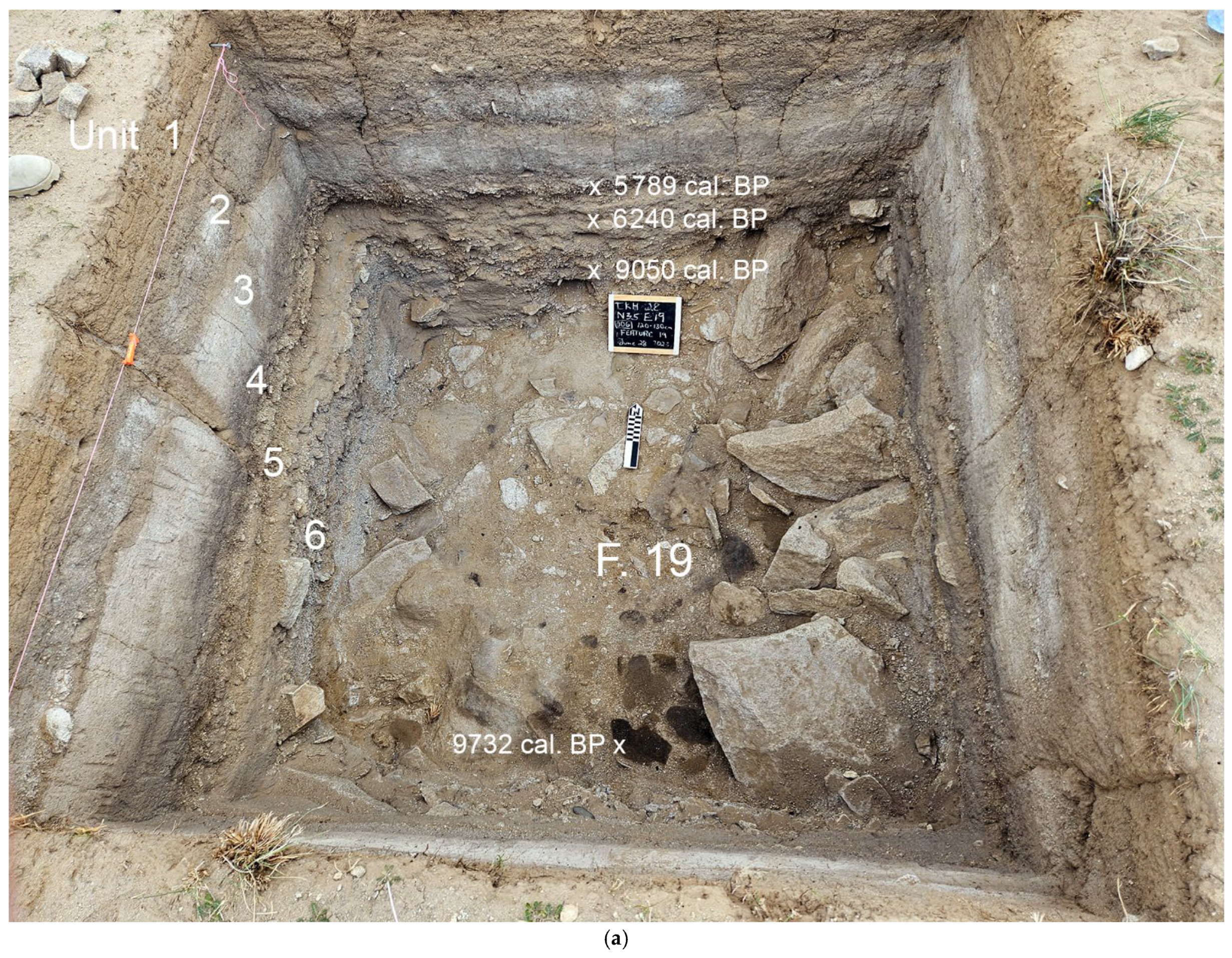 - Pleuger, S.; Breitenfeld, B.; Zoljargal, A.; Nelson, A.R.; Honeychurch, W.; Amartuvshin, C. What’s in a Hearth? Preliminary Findings from the Margal Hunter-Gatherer Habitation in the Eastern Mongolian Gobi Desert. Asian Perspect. 2023, 62, 131–158. [Google Scholar] [CrossRef]