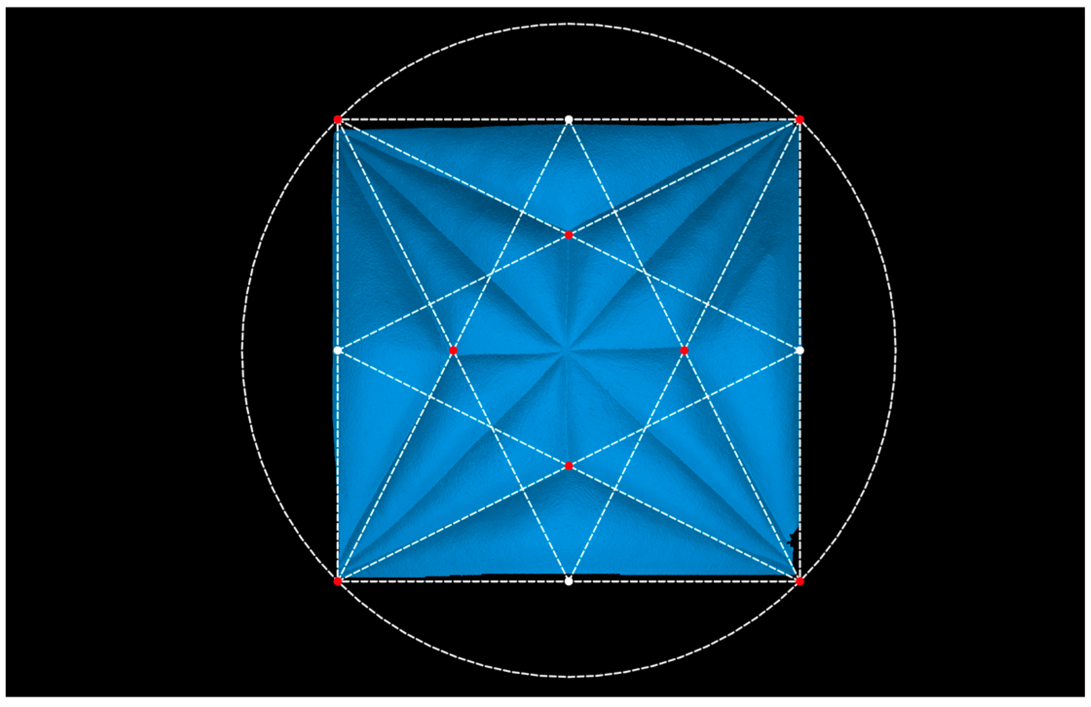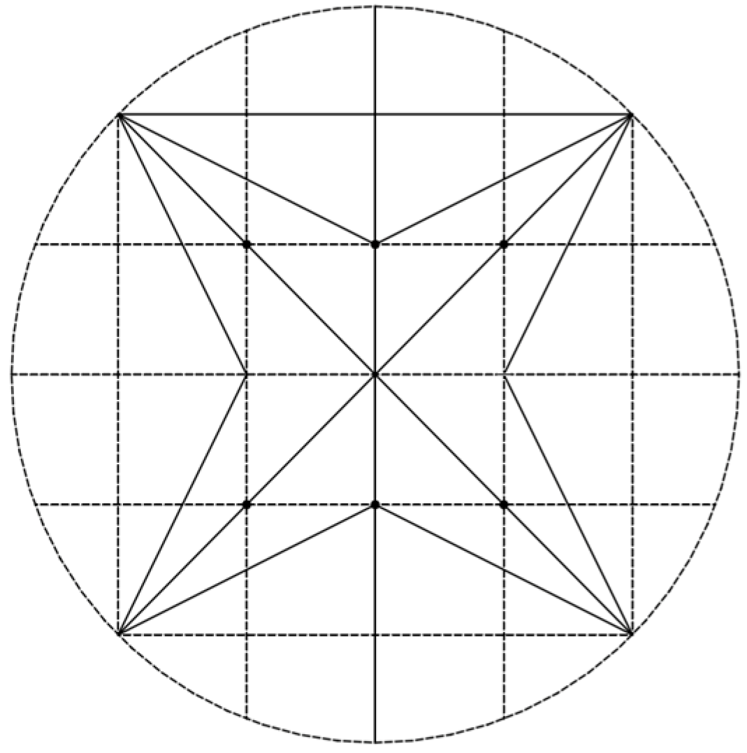 First, we will consider the plan layout of the star-shaped vaults. The first option we will consider is to align the secondary ribs (or tiercerons) on the bisector between the diagonal and the side of the square. This, developed graphically, can be obtained in a simplified manner by inscribing the square of the plan within a circle and extending the tiercerons to one of its singular points. This solution using a circle can also be achieved with rectangular plans, obtaining similar results (ad germanicum) (Figure 2).