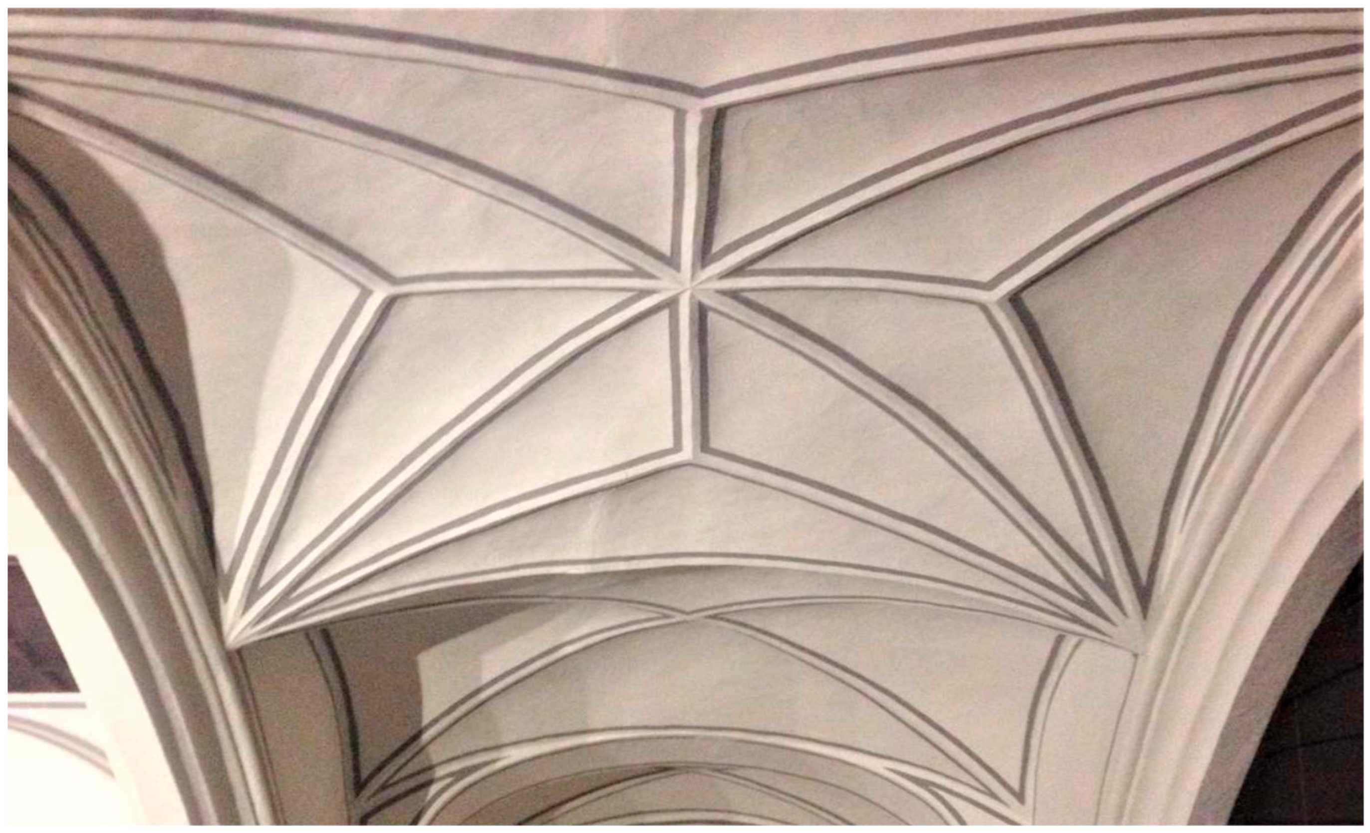 The first examples that we can define as star-shaped vaults occurred in France during the Radiant Gothic period. According to Barrón [3] (p. 222), These star-shaped vault designs date back to the 13th century, and the most notable is the transept of Amiens Cathedral (1264). We are therefore talking about the evolutionary process of the Gothic style: increasing the number of keystones and ribs and facilitating construction by reducing the number of plenums. Furthermore, the name is immediately apparent given the stonemasons’ design: two diagonals in simple vaults, hence the “cross vault”; and star-shaped in cases with multiple ribs.