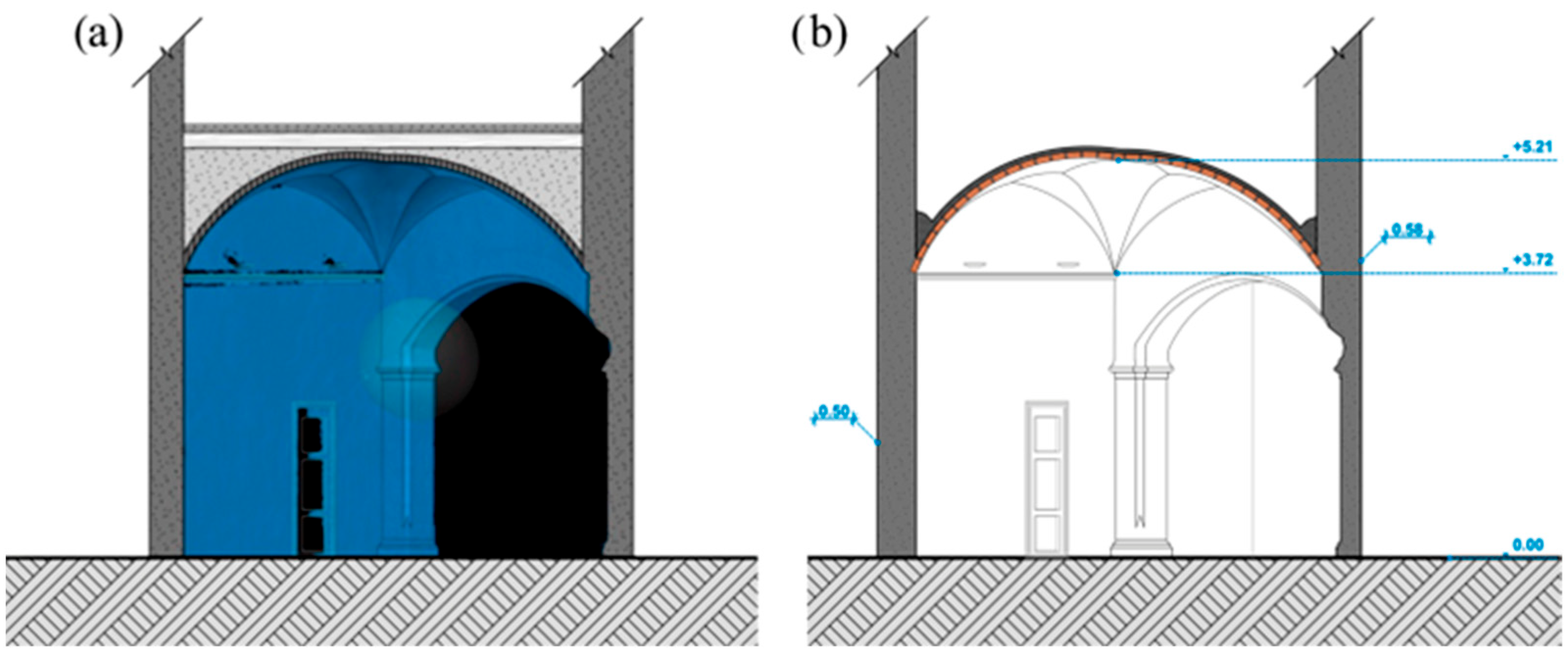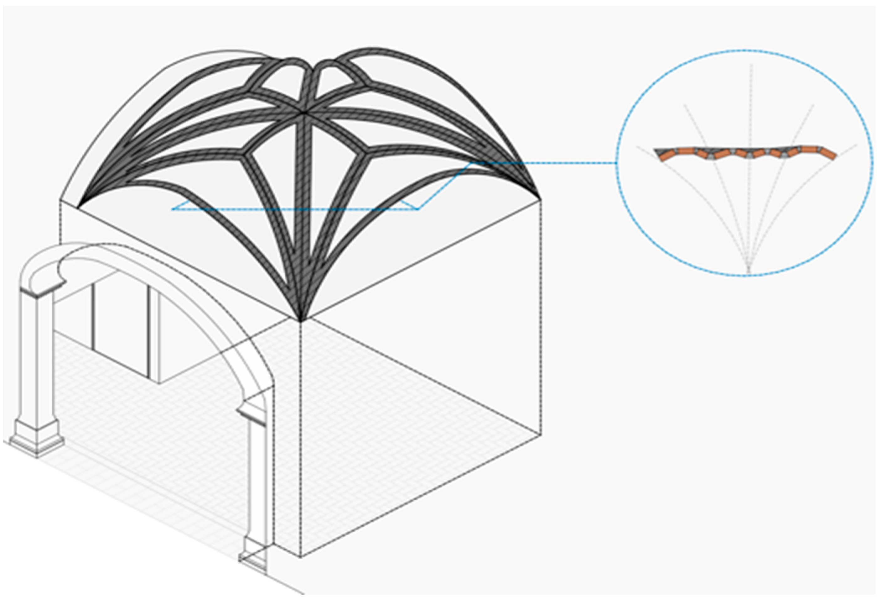 Although the economic value and the ease of not needing formwork for its execution are valued, Javier Ibáñez points out that “the structural ribs and Gothic fragmentations could not disappear permanently as long as the floor plan configurations were maintained” [44] (p. 87). In fact, especially in exceptionally stretched vaults, the ribs should continue to be turned, in some way, although hidden by the extrados, to ensure stability [44] (p. 87). In this regard, it is worth recalling Thunissen’s statement: “The ribs could be placed either under the vault’s shell or between the panels, so that the shell exerted a lateral thrust on them; sometimes they protruded beyond the back of the webs” [45] (p. 169) (this is how Brunelleschi’s creste e vele vaults, built in Florence throughout the 15th century, are conceived).