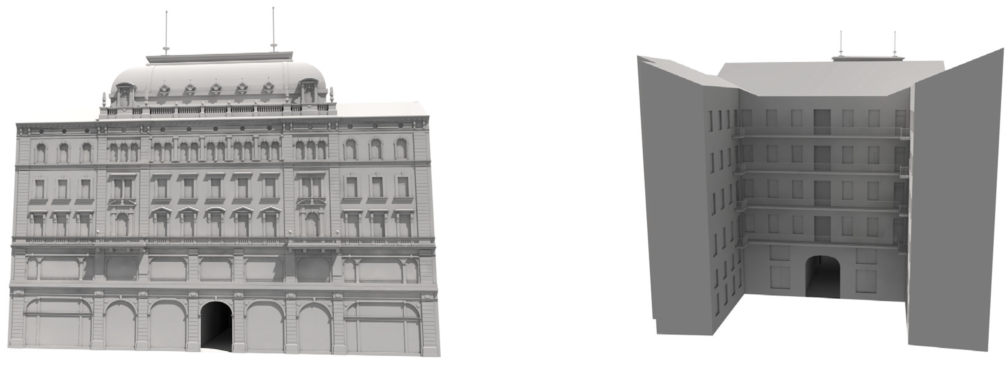 - Archive documentation-driven modelling: only elements supported by archival docs were modelled. Where documentation is missing (e.g., courtyard façades), simplified geometry (only openings) was used, usually without ornamentation. Therefore, no speculative geometry is used: in cases of missing information, model elements were omitted without creative reconstruction. Based on this principle, the main façades are typically fully decorated, while the courtyard façades are often left without decorations (see Figure 8). Only the suspended corridor and a stylized railing are built in the courtyard.