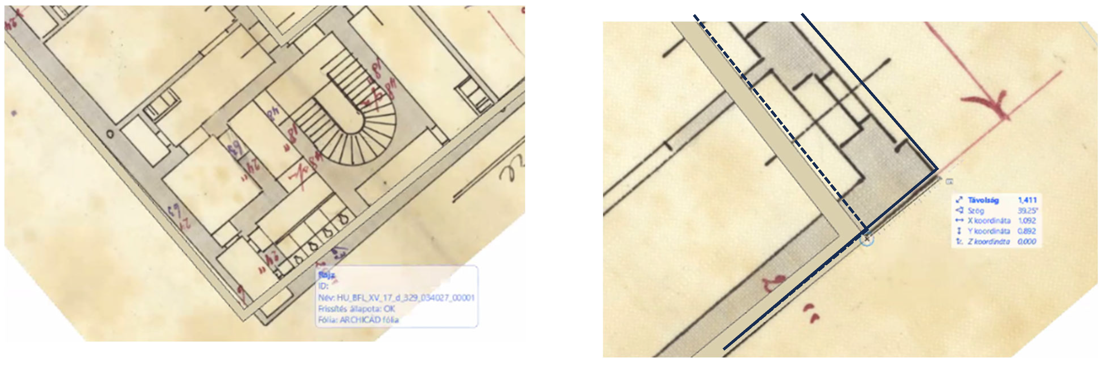 - Adjustments: If necessary, students should make minor adjustments to the building plans based on the provided cadastral map. This is important because it ensures that there will be no overlaps or gaps between the models during subsequent street view visualization. In most cases, aligning buildings with the plot is not a problem. The deviation is less than 50 centimeters at most. In extreme cases, the difference between the cadastral map and the ground floor plan has been as much as 1.5 meters. In such cases, a decision is made on a case-by-case basis, with the instructor determining which geometry should be used for modeling.