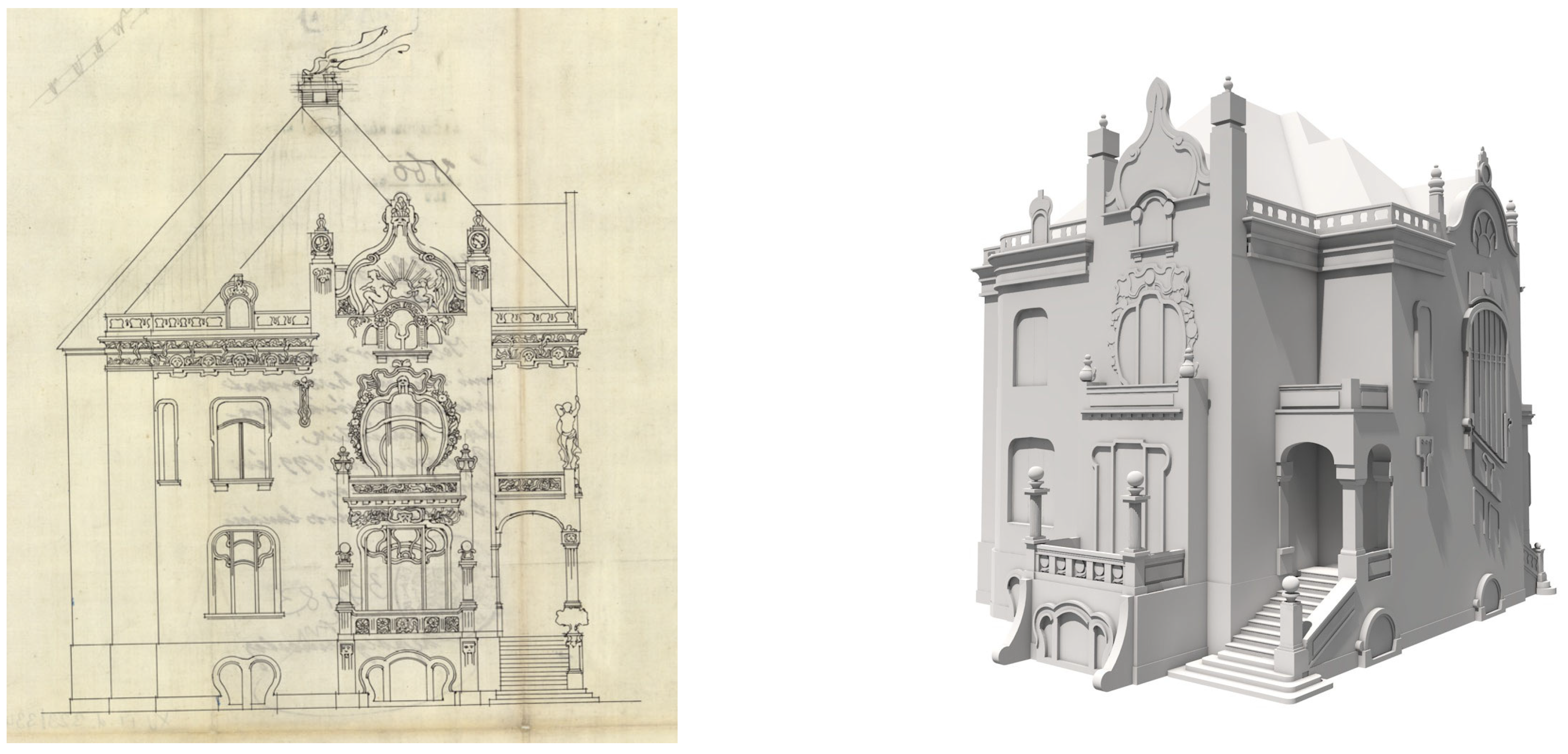 - Calka, B.; Jaczewska, P.; Slowik, J. Integration of Multi-Source Archival Data for 3D Reconstruction of Non-Existent Historical Buildings. Appl. Sci. 2025, 15, 299. [Google Scholar] [CrossRef]