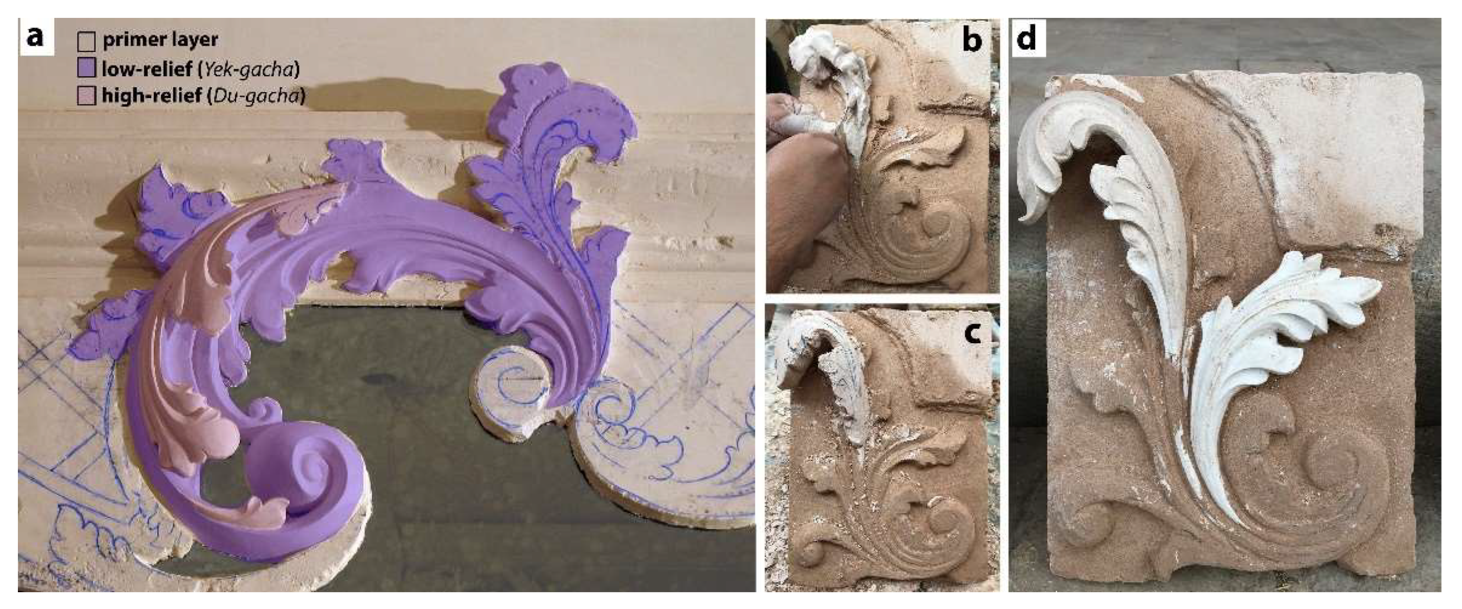Carving requires a quick-setting gypsum known as gach-i tīz15. The first carving layer with gach-i tīz typically establishes the background. This process defines the low-relief technique, or Yek-gacha16. For high-relief stucco, a more viscous subsequent layer with a cream-like consistency—known as gach-i khvosh-māya17 [58]—is applied in what is termed the Du-gacha technique (Figure 4). Its higher water content prevents premature drying when laid over gach-i tīz and facilitates easier shaping. This layer produces the high-relief effect by adhering more firmly to the underlying surface. Finally, a third layer, “Seh-gacha18, was rarely employed to create very high-relief; this mixture has a consistency similar to gach-i tīz. Contrary to popular belief, all these layers consisted of nearly pure gypsum without added materials.