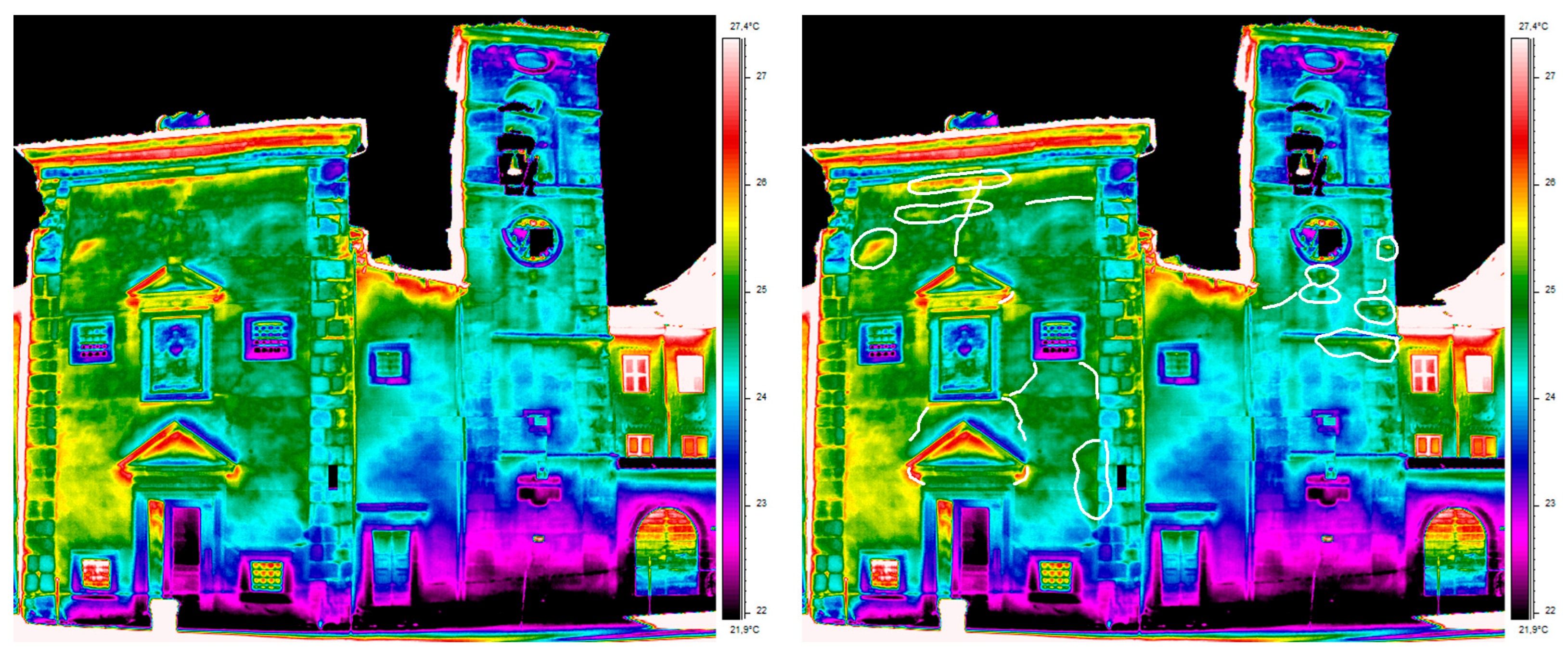 - Paoletti, D.; Ambrosini, D.; Sfarra, S.; Bisegna, F. Preventive thermographic diagnosis of historical buildings for consolidation. J. Cult. Herit. 2013, 14, 116–121. [Google Scholar] [CrossRef]