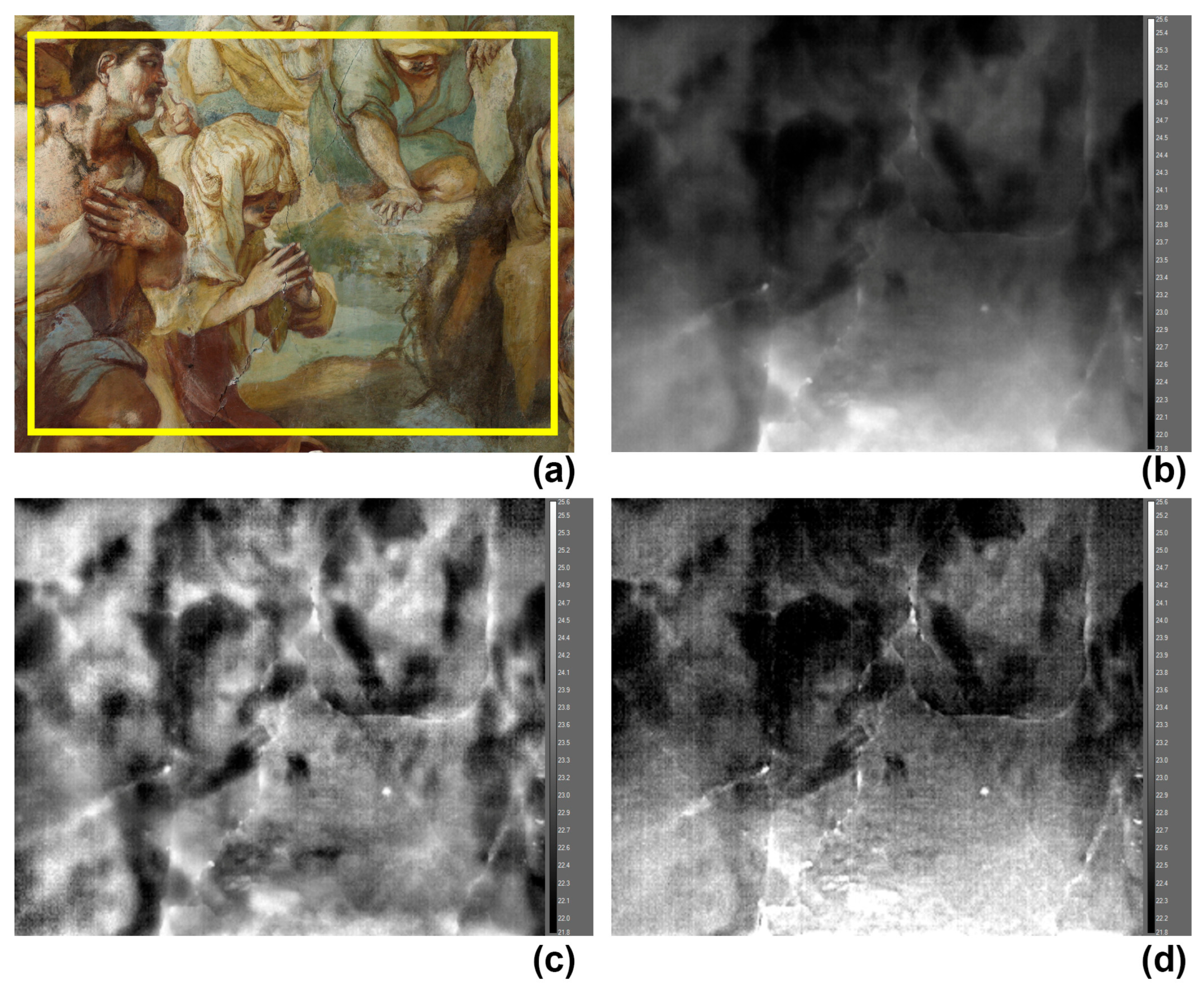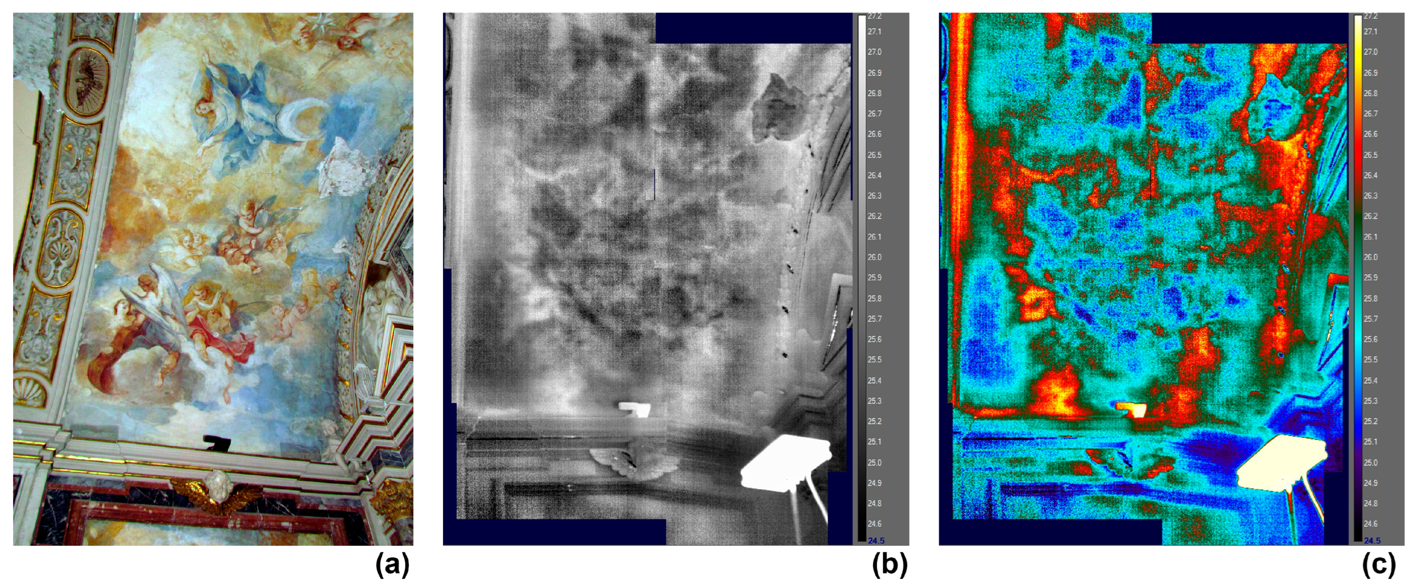 - Sfarra, S.; Ibarra-Castanedo, C.; Ambrosini, D.; Paoletti, D.; Bendada, A.; Maldague, X. Non-Destructive Testing Techniques to Help the Restoration of Frescoes. Arab. J. Sci. Eng. 2014, 39, 3461–3480. [Google Scholar] [CrossRef]