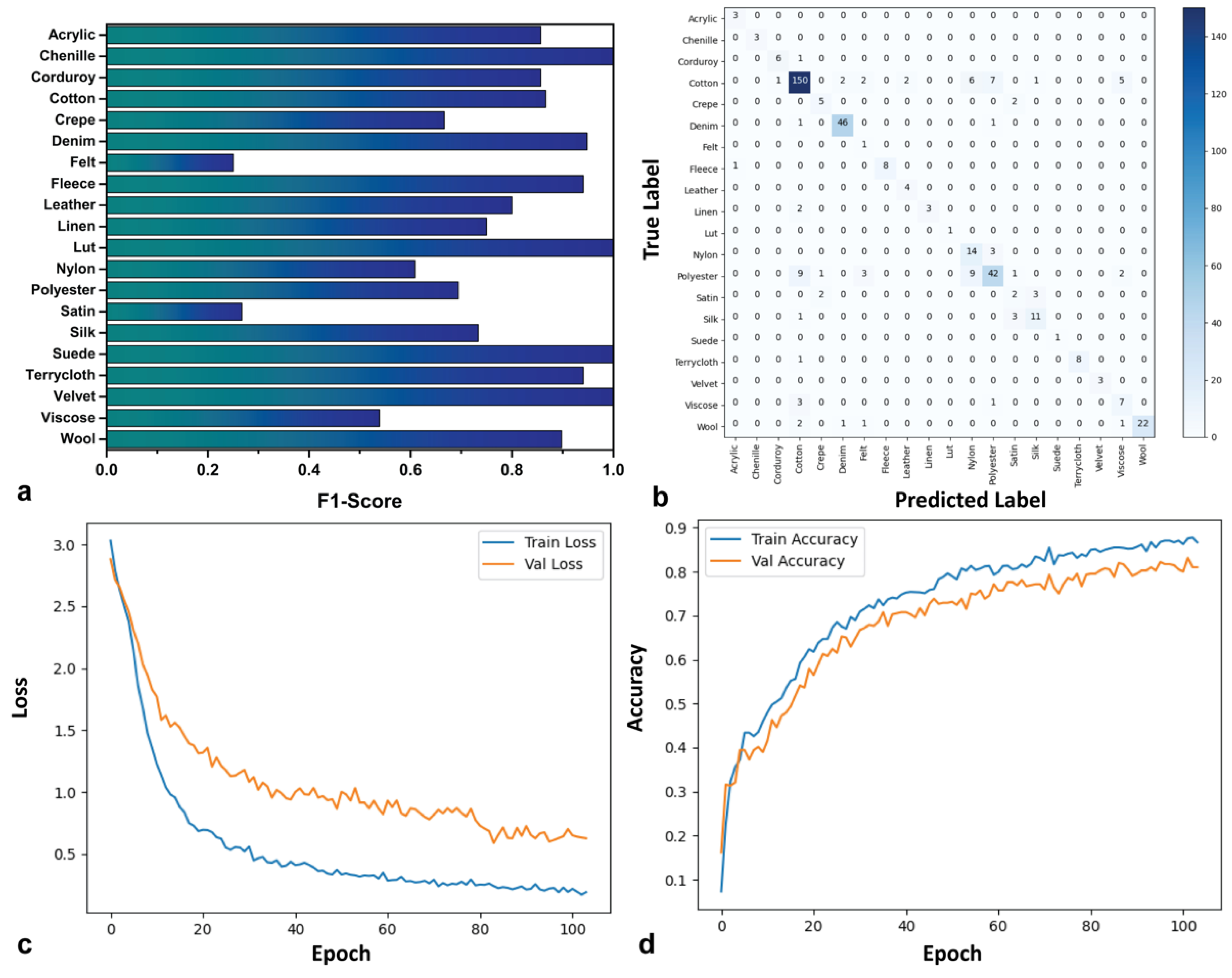 Figure 2d) rises rapidly and reaches a plateau near 95.27%, while the validation accuracy reaches 85.18%. Despite the gap, the model exhibits strong generalization ability, and the overall performance is considered robust across both frequent and less-represented textile classes. The observed fluctuations, which are more pronounced in validation curves rather than in training curves, reflect the model’s sensitivity to class imbalance in the validation due to challenges in generalization across underrepresented classes.