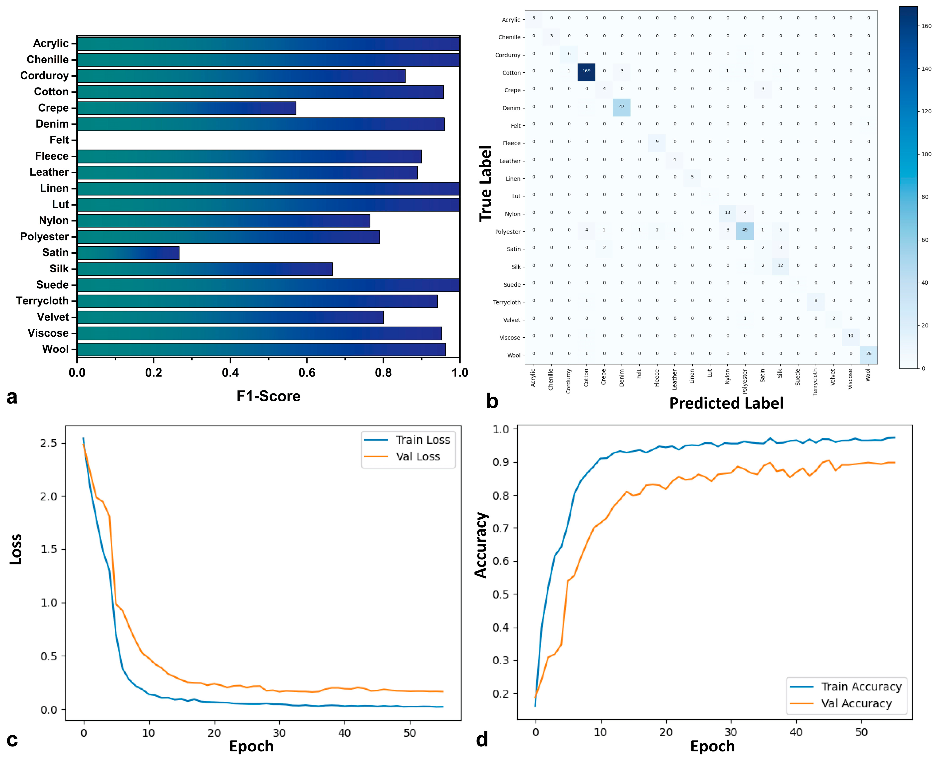 Figure 2b), the model achieves significant success in recognizing several classes. Cotton is identified with high confidence (f1-score: 0.94, recall: 0.95, precision: 0.94), consistent with its dominance in the dataset. Denim and Polyester classes also exhibit excellent performance, with f1-scores of 0.97 and 0.83, respectively. Satin remains a challenge, as with ResNet50 results. Its f1-score of 0.50 and recall of 0.57 both suggest confusion with other classes. On the other hand, Viscose performs satisfactorily (f1-score: 0.66), indicating a balanced classification. Classes like Crepe, Acrylic, and Corduroy present a mid-performance ability (f1-scores: 0.67–0.80). While Acrylic shows a reasonable f1-score, Crepe remains a relatively difficult class, although its performance is improved in comparison to ResNet50. Classes like Leather, Chenille, Linen, Suede, Velvet, and Lut are perfectly classified (f10scores: 1.00), but given their small number of samples, these results should be interpreted with caution and are not strong indicators of generalization ability. In any case, the distinctive morphological characteristics of Leather in comparison to all the other classes should be taken into consideration.