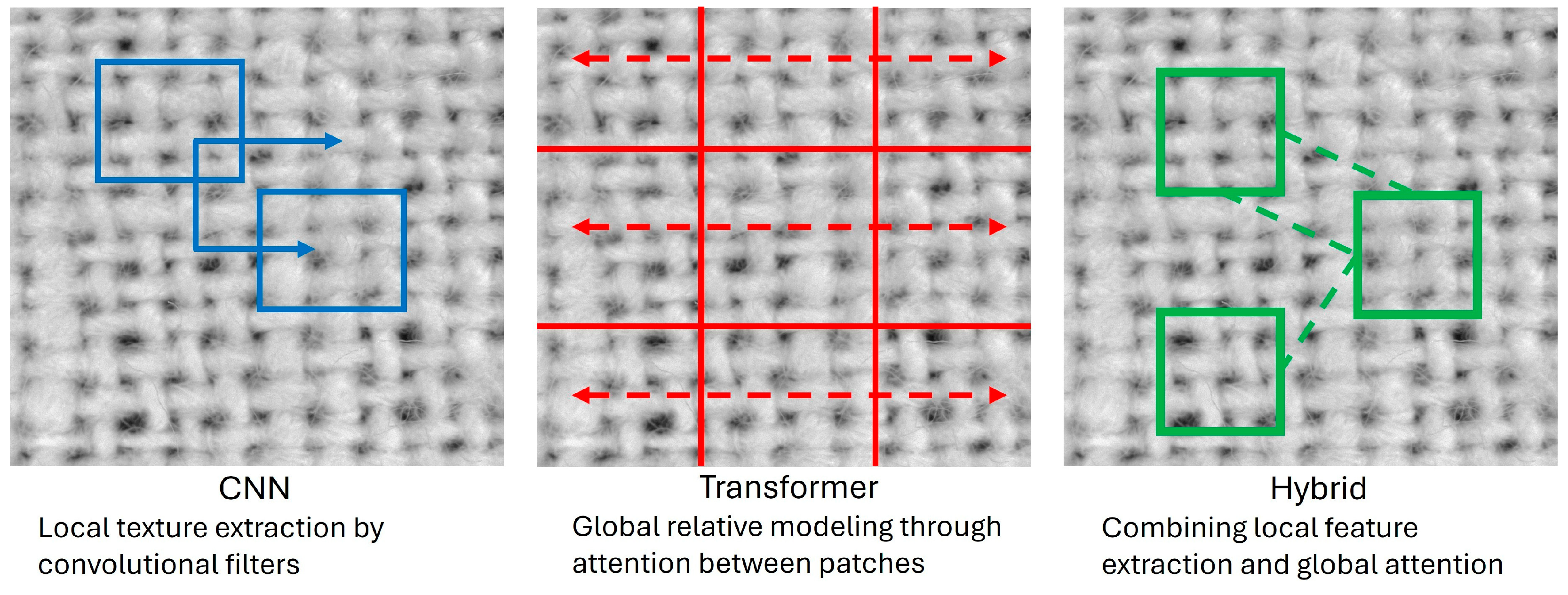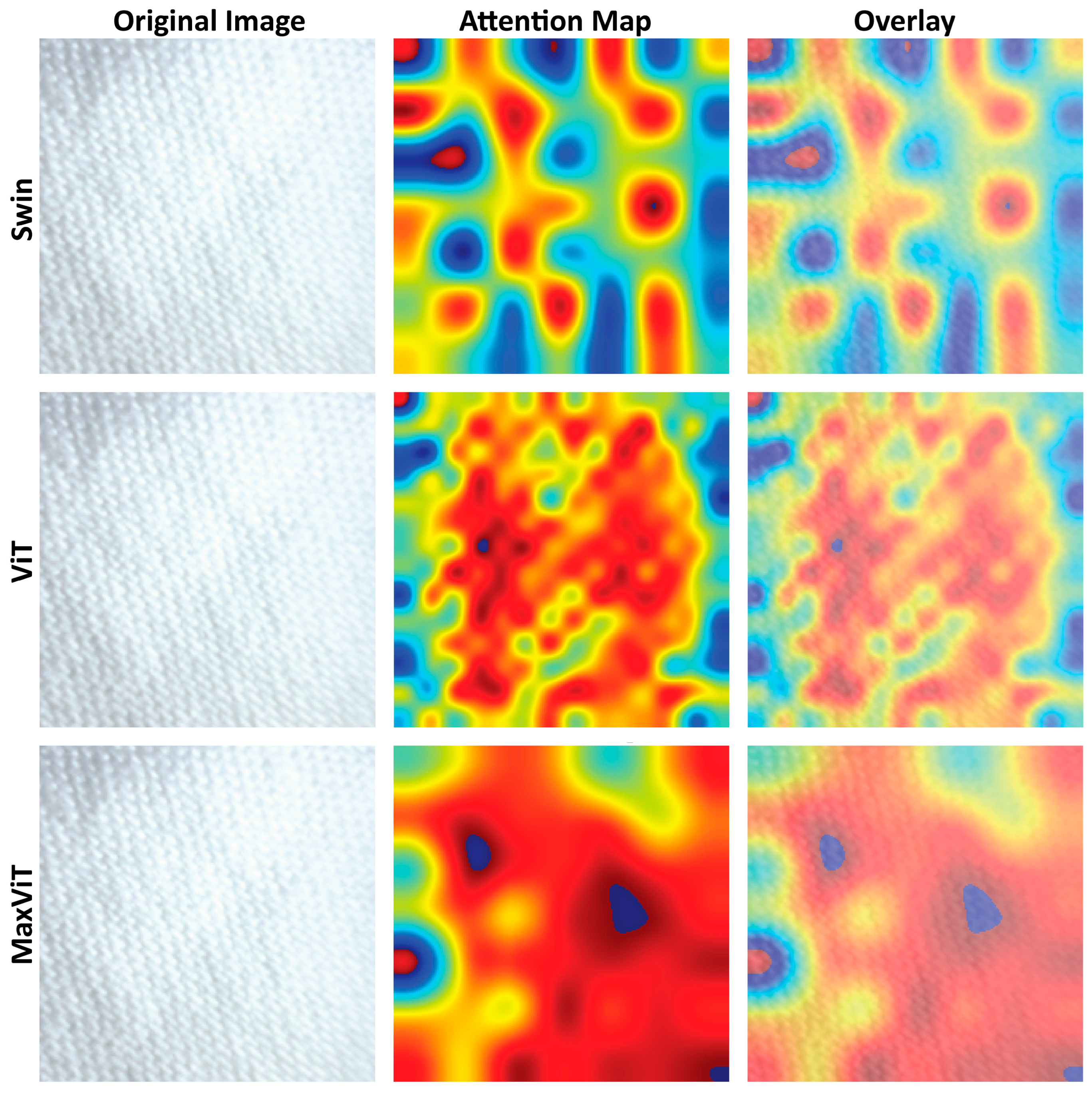 Swin Transformer: The attention map for the Swin Transformer reveals a focus on distinct, “patched” areas of the texture. This directly reflects the window-based self-attention mechanism of Swin Transformer, where attention is computed within local windows that are shifted in subsequent layers. The model captures local interactions within these windows and aggregates information hierarchically.