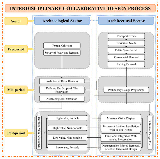 The first stage of the project is the archaeological prediction of the project site. At this stage, the process is led primarily by archaeologists. Predicting the possible layout of the archaeological site and assessing potential risks of the archaeological site are very important for guiding future developments, conservation, and exhibition design. During this stage, predictive models play an important role in predicting the location of archaeological sites or materials in a region [37]. The prediction also relies on historical documents and archaeological information. Historical documents are important for restoring the ancient city plan, and archaeological sites excavated around the project area are solid evidence for predicting the archaeological layout underneath the site. During the construction of the Athens Metro, the archaeological forecasting phase at stations such as Syntagma Square and Monastiraki involved multidisciplinary collaboration among archaeologists, historians, and other specialists. The metro line design was progressively adjusted to accommodate and integrate archaeological remains through stratigraphic analysis and predictive archaeological modeling. Ultimately, this approach enabled the harmonious coexistence and exhibition of heritage sites within the station structures [38].