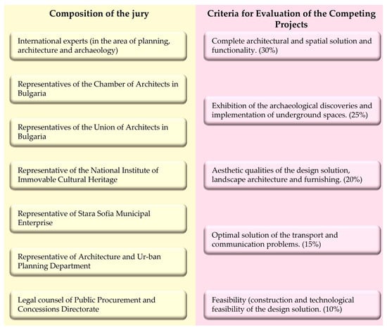 At this stage, architectural professionals develop preliminary design proposals based on archaeologists’ predictions of the location and extent of heritage remains, while simultaneously integrating public needs related to transportation, exhibitions, public spaces, commercial functions, and parking. The scope of archaeological excavation is then determined according to these preliminary designs. In the Serdica Complex project, the tendering process was organized to involve a multidisciplinary panel composed of experts from various institutions. This professional jury evaluated the completeness and quality of the proposals from multiple perspectives, ensuring a balanced and coordinated approach to both heritage conservation and infrastructure development (Figure 5).