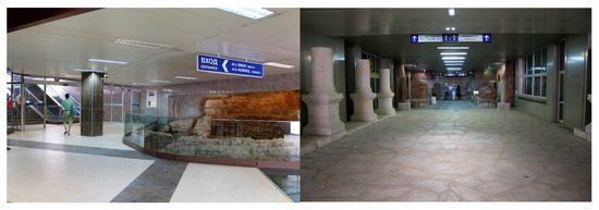 In the case we study, most archaeological sites are protected in situ. Some archaeological exhibitions can also serve as nodes of the underground transit system, connected to other activity areas by paths. For example, the in situ exhibition integrated into the entrance of the station Serdica II is an important hint for the visitors from the metro station to the exhibition of archaeological sites. And the Eastern Gate of Ancient Serdica, excavated in the 1950s, has again become the eastern gateway to the complex of the underground transportation system and exhibition of the ancient city (Figure 7).