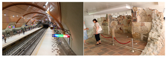 Ex situ protection is also adopted in the case we study. Serdica II station has set up 12 showcases on both sides of the platform to exhibit archaeological artifacts excavated from the project areas, depicting the city’s history. Meanwhile, the remains of a Christian church discovered near the project site are exhibited in the underground exhibition hall under Independence Square, with the frescos restored as close to the original as possible (Figure 8).