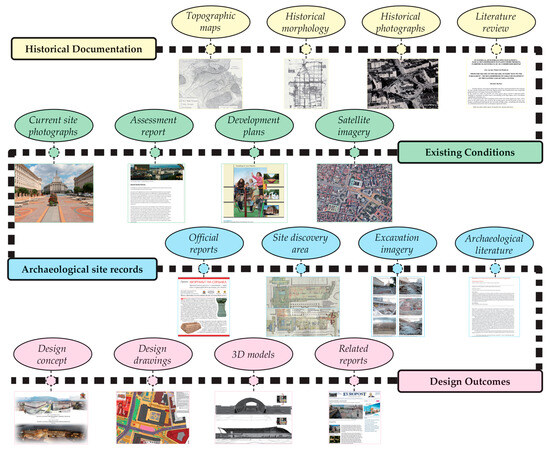 In the case of the Serdica Complex, the project systematically collected and analyzed multiple types of baseline data—including historical records, archaeological findings, current site conditions, and official design proposals—prior to design and construction (Figure 9). These complementary sources played distinct yet interrelated roles: historical records provided the basis for understanding the heritage context and urban form, while current site conditions ensured that protection measures responded to the contemporary environment. Archaeological data revealed the spatial configuration and cultural values of buried remains, and design proposals demonstrated how heritage attributes could be embedded into architectural and infrastructural planning. Together, these materials not only established a comprehensive framework for documenting and monitoring changes during construction but also offered a systematic analytical pathway that deepened the understanding of how heritage conservation can be effectively coordinated with underground urban development in archaeologically sensitive contexts.