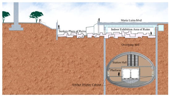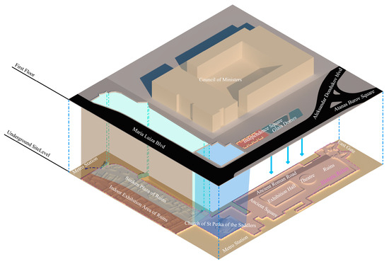 In the case study, different functions are arranged vertically on different layers before TZUM. From top to bottom, on the surface lays the major road of Sofia’s important traffic road from north to south, M. Luiza Blvd; 3 to 6 m underneath the road is indoor exhibition of archaeological sites, which was linked by glass curtain wall at the long side with the sunken plaza; from 6 to 13 m underground is overlying soil, and Serdica II metro station was placed 30 m deep down to avoid the disturbance of the archaeology sites (Figure 11). The New Austrian Tunneling Method was adopted to construct the station to reduce the damage to the heritage during construction [52].
