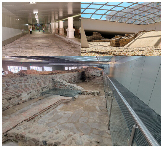 The formulation of heritage conservation strategies should be grounded in a comprehensive understanding of the site’s inherent value. This requires an integrated assessment of the preservation status of both the site and its surrounding environment, the completeness and necessity of the proposed interventions, the degree of public acceptance, and the economic viability of the investment. In the case of the Serdica Complex project, two primary conservation strategies were adopted: in situ and ex situ (Figure 6). The two strategies are often combined according to the context and the nature of the heritage. The excavation findings can be categorized into two different kinds: archaeological artifacts and in situ remains. Portable artifacts such as marble sculptures, pots, and coins are collected and restored for further study and exhibition. In situ remains, such as building foundations, floor mosaics, walls, wall paintings, and ancient roads, which are significant for evidencing the ancient city’s layout, are displayed or ex situ according to the nature of the sites. Archaeology finds with low historical and cultural significance can be revised or removed after being documented to meet other functional demands of the project (Figure 2). For example, at the Milan Cathedral Metro Station, extensive archaeological remains were uncovered during construction and expansion works, including Roman-era sites such as ancient city walls, bathing facilities, and early Christian baptistery remains. Archaeological supervision measures were implemented throughout the excavation to document, protect, and partially exhibit the unearthed heritage. These findings are displayed in an exhibition hall beneath the Milan Cathedral, for those heritage elements that could not be relocated for preservation, an in situ sealing protection approach was adopted [48].
