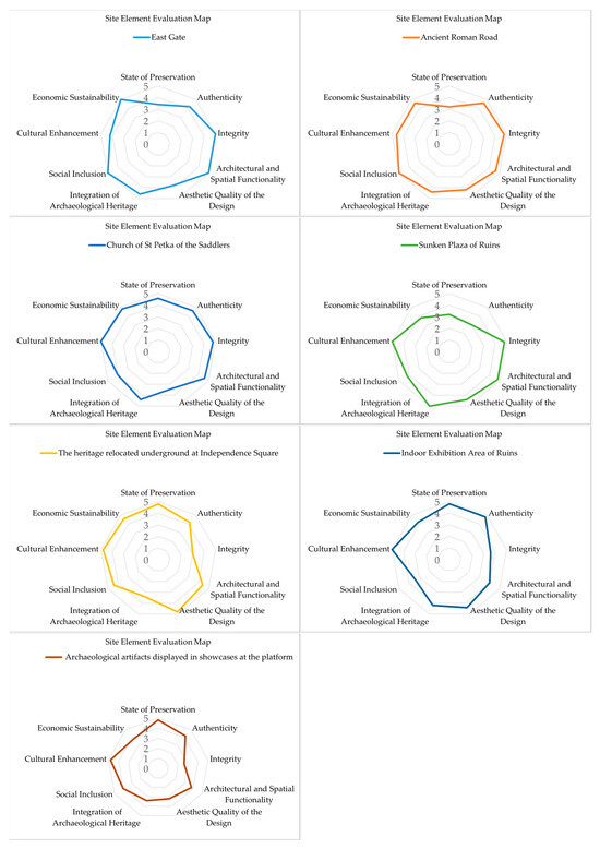 Based on this evaluation framework, a comprehensive assessment was conducted on seven key heritage components: the East Gate, Ancient Roman Road, Church of St Petka of the Saddlers, Sunken Plaza of Ruins, the heritage relocated underground at Independence Square, Indoor Exhibition Area of Ruins, and Archaeological artifacts displayed in showcases at the platform. The final evaluation results represent the average scores derived from the independent assessments of the five experts. The results indicate that the Serdica Complex project demonstrated a strong foundation in safeguarding the core values of these heritage elements, while simultaneously assigning them new functions that allow for meaningful integration into contemporary urban life. This approach plays a significant role in the transmission and public engagement with Roman cultural heritage (Figure 13).