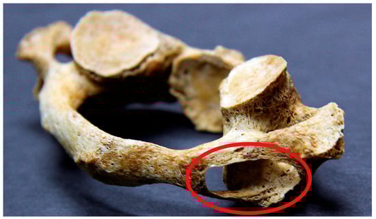 - Krishnamurthy, A.; Nayak, S.R.; Khan, S.; Prabhu, L.V.; Ramanathan, L.A.; Kumar, C.G.; Sinha, A.P. Arcuate foramen of atlas: Incidence, phylogenetic and clinical significance. Rom. J. Morphol. Embryol. 2007, 48, 263–266. [Google Scholar]