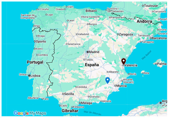 Map of the Iberian Peninsula (Google, s.f.) that shows the location of the Chalcolithic Camino del Molino site (blue) and Valencia city (black).