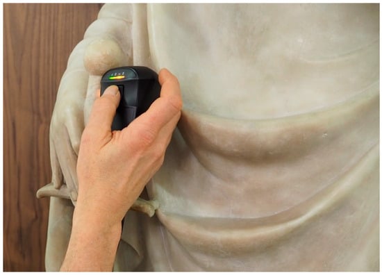 Its dimensions of 82.2 × 66 × 43.5 mm and its weight of less than 150 g make this device ultra-portable (Figure 1). Connection to a PC (ISC WinForms SDK GUI v3.9.4 software) via USB or a smartphone (ISC NIRScan v3.8 app) provides versatile use in the working conditions in museums or other collections. The measurements are non-invasive and can even be performed without direct contact between the sapphire window and the object being examined, although the best performance is achieved when the sapphire window is placed directly on the object []. All measurements were conducted in diffuse reflectance mode with the Spectralon® diffuse reflectance material as reference signal [].